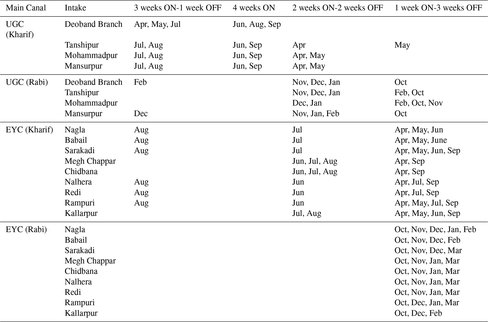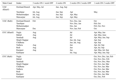 The canal system is operated in two irrigation seasons: the Kharif and Rabi seasons. Kharif season extends from March to September, in which the main irrigated crops are sugarcane and rice, and the Rabi season spans from October to March of the following year, where the principal crops are wheat and mustard. The irrigated croplands represent more than 85 % of the basin, while only about 10 % of the basin's area is covered by non-croplands (Fig. A2). Irrigation water is diverted from the canals to supply the basin through off-takes that serve fixed command areas with crops rotated between Rabi and Kharif crops (Fig. 1).