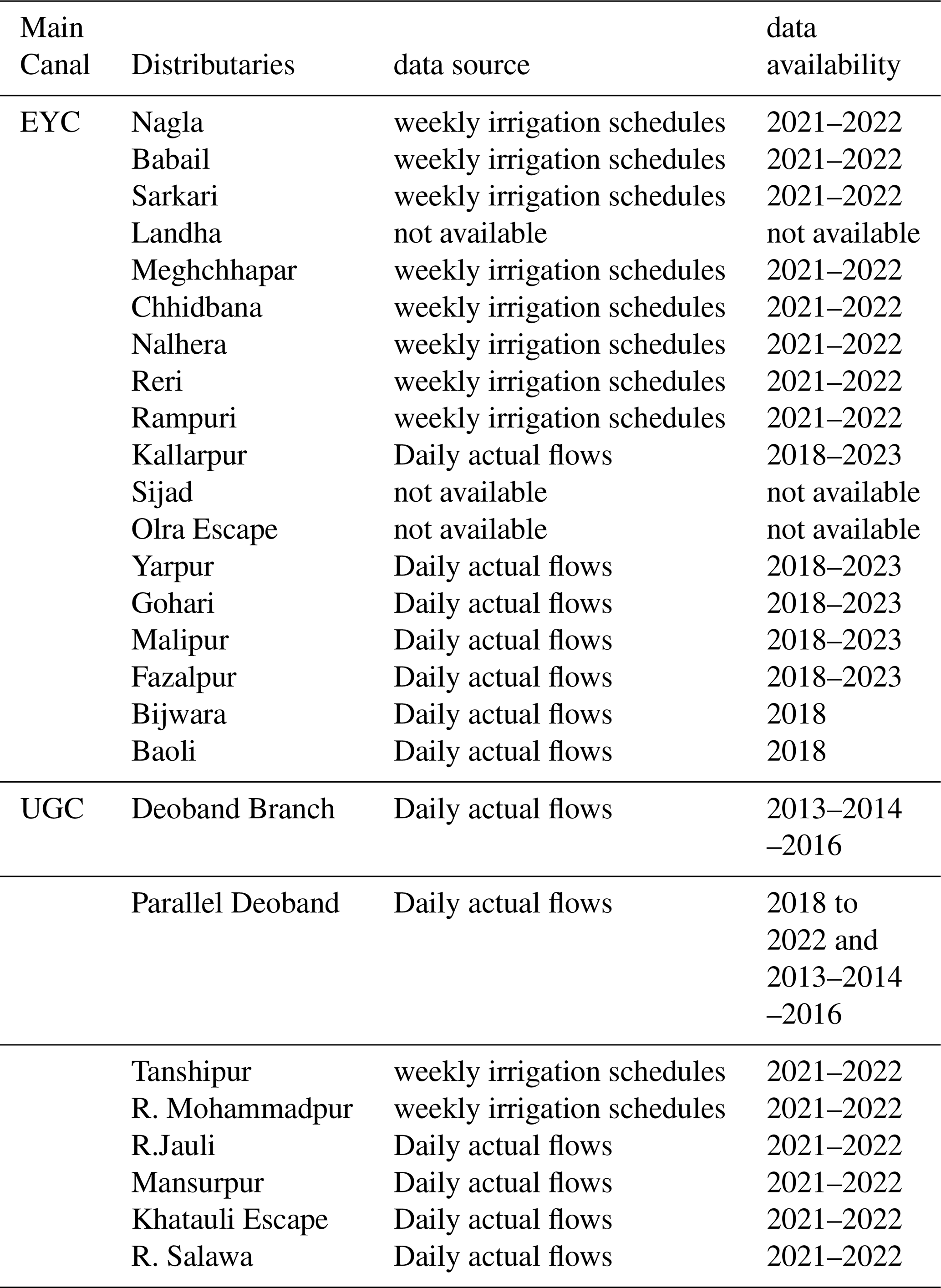 The in situ data used in this analysis are obtained from governmental agencies, including the Central Water Commission (CWC) of India for streamflow data and the irrigation department of Uttar Pradesh for external canal water imports data. While river discharge data has no gaps, canal delivery data are constrained by their spatial and temporal coverage. The latter comes in two forms: irrigation schedules and actual flow measurements. We apply an extrapolation approach that combines both data sources to generate complete monthly estimates for all intakes (for more details on the adopted gap-filling technique, refer to Appendix A2).