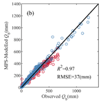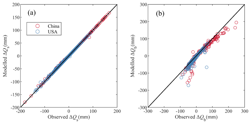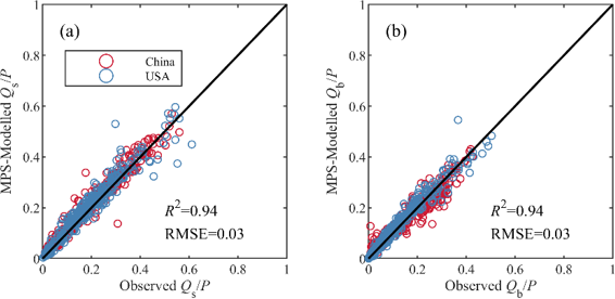Figure 5 shows the estimated mean annual Qs, Qb and Q in validation periods using the MPS model with inverted parameters in Eq. (14) in China and the CONUS. The simulated runoff components match very well with the observed, with R2 greater than 0.97 and RMSE less than 66 mm. There is no significant difference in the performance in simulating Qs, Qb, and Q, except for a slight underestimation in simulating Qb of catchments in China and some in the CONUS.