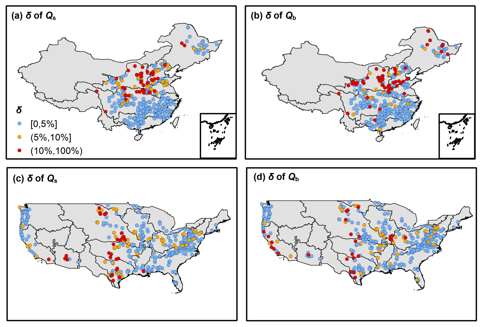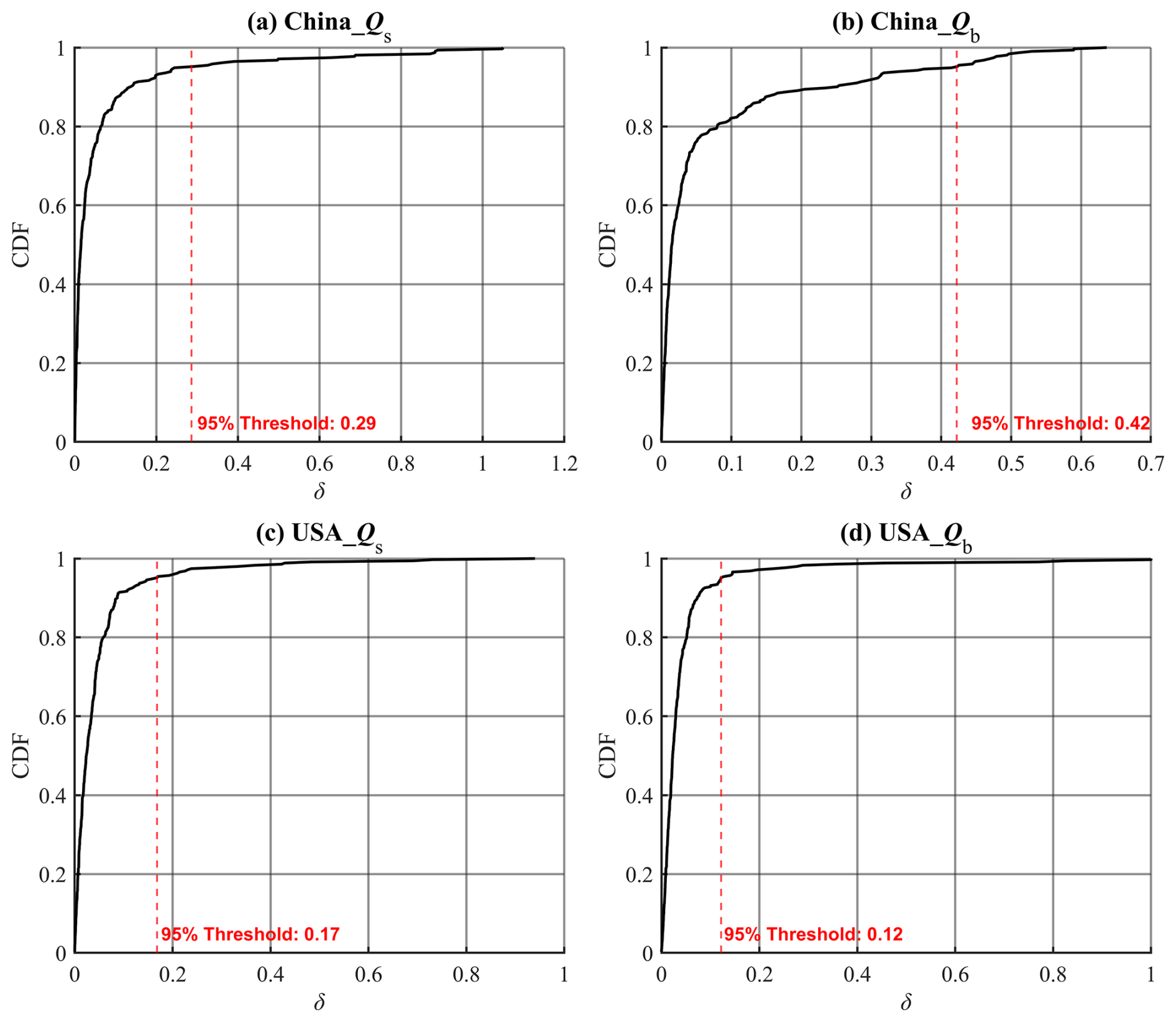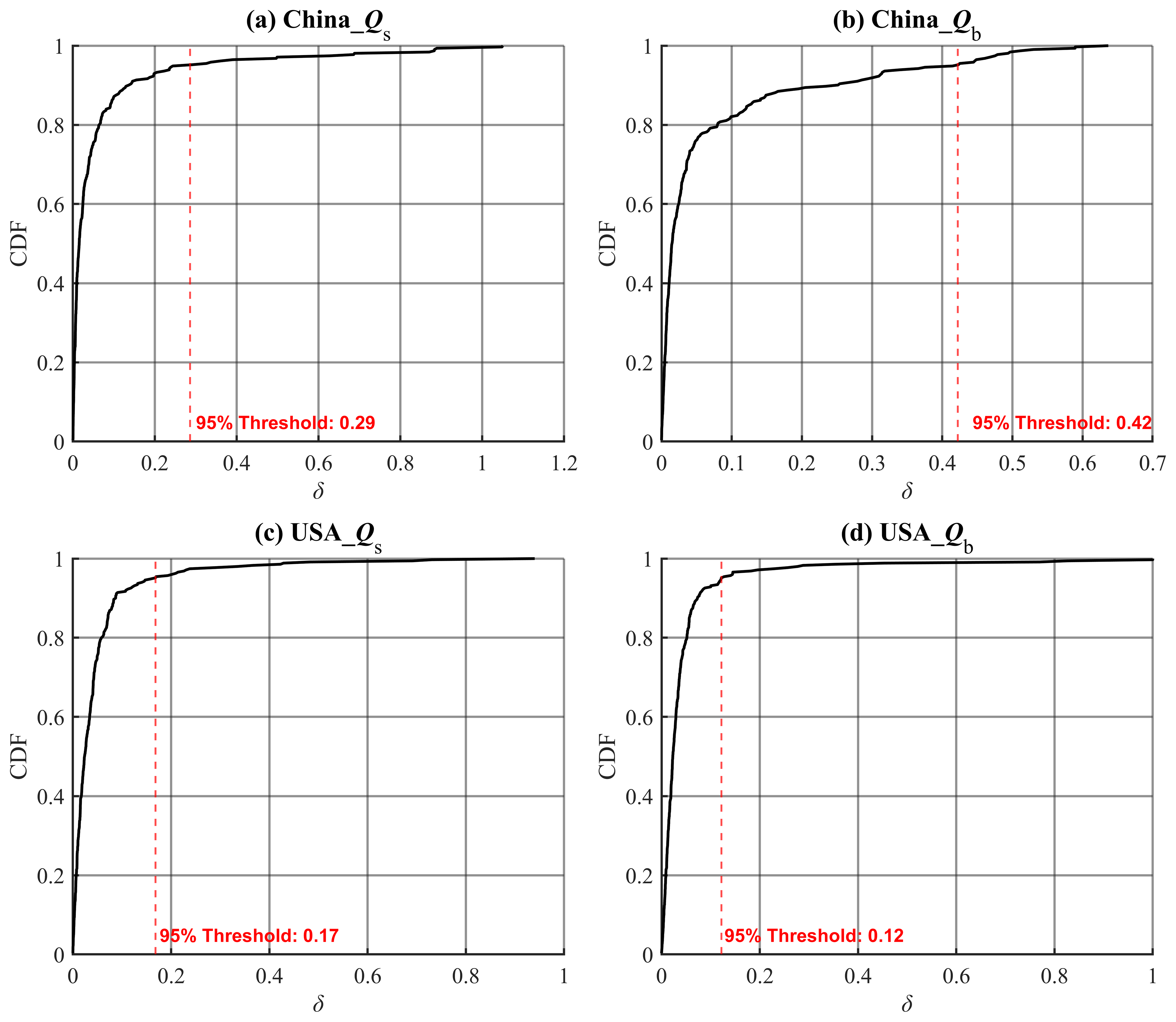 Figure 2Cumulative distribution functions (CDFs) of the relative bias (δ) for each dataset, represented by four subplots corresponding to different regions and variables: (a) China_Qs, (b) China_Qb, (c) USA_Qs, and (d) USA_Qb. Each subplot includes a red dashed line indicating the 95 % δ threshold.
