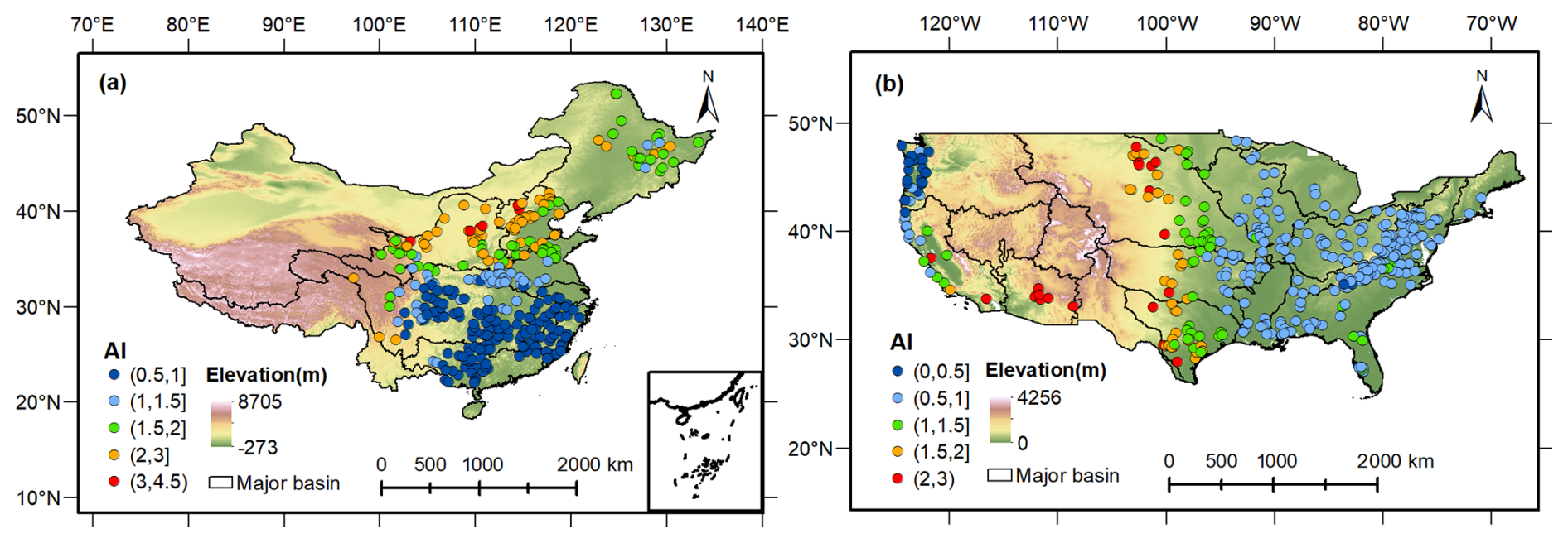 Figure 3Location of hydrological stations for the (a) 312 catchments in China and (b) 350 catchments in the CONUS, colored by the value of aridity index (ϕ, namely E0/P).