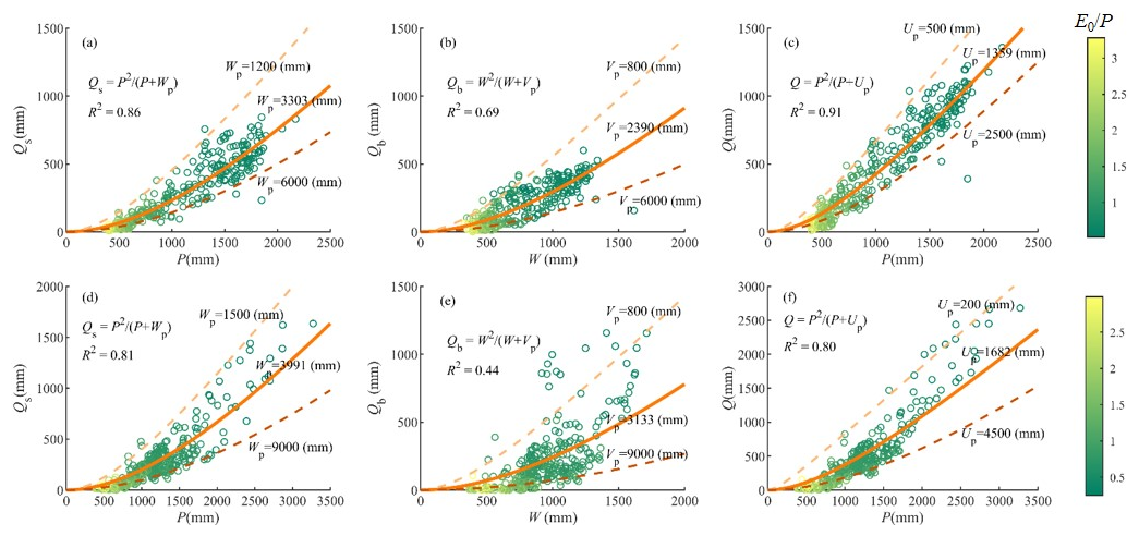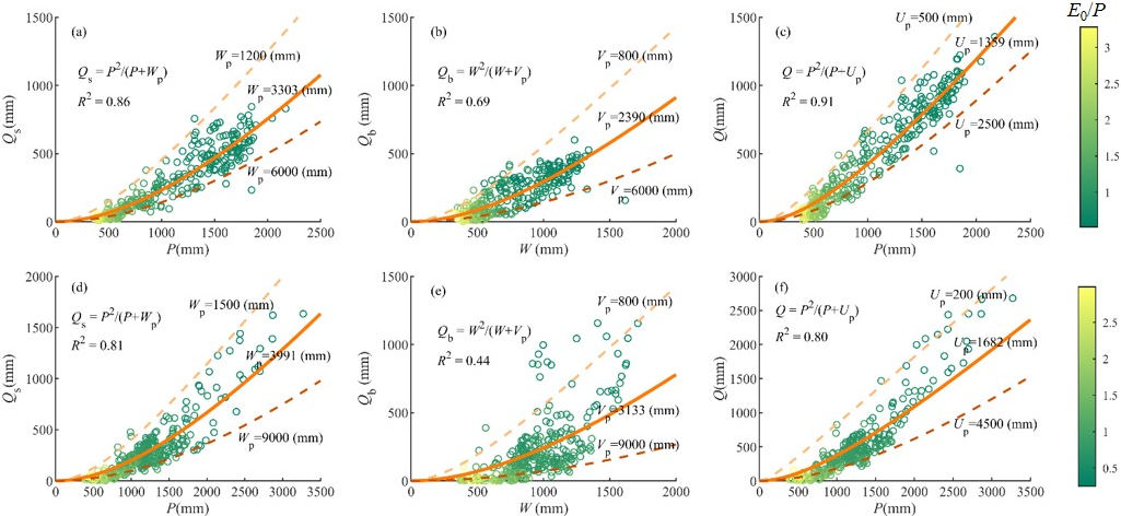 Figure 4 demonstrates that the MPS model can effectively reproduce the spatial variability of different runoff components along with the aridity index (E0/P), which are primarily controlled by the available water of the corresponding partition stage. The performance of MPS model to fit Qs and Q is better than that of Qb, indicating that the factors controlling Qb are more complicated and not fully reflected in the model. With catchment properties and other factors (integrated by the parameters in the MPS model) remaining unchanged, the more the available water, the higher the runoff generated. Conversely, smaller parameter values are associated with greater runoff for a given amount of available water.