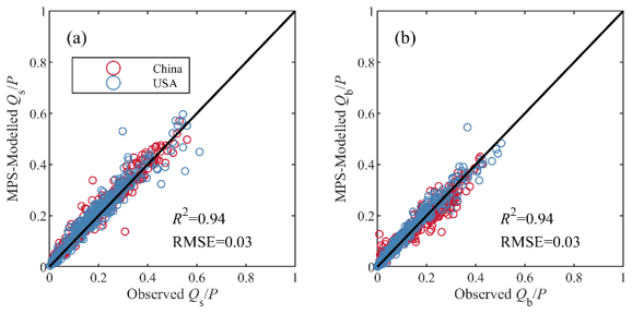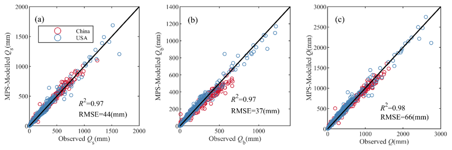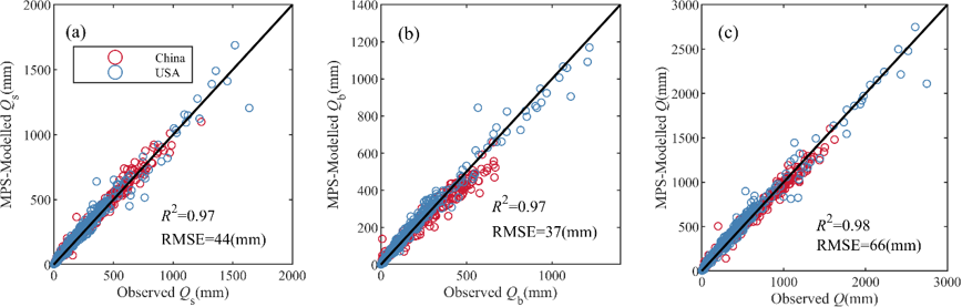 2. The MPS model effectively simulates multi-year runoff components with R2 exceeding 0.97, and the proportion of runoff components relative to precipitation with R2 exceeding 0.94. The spatial distribution of the parameters across China and the CONUS is related to that of climate zoning.
