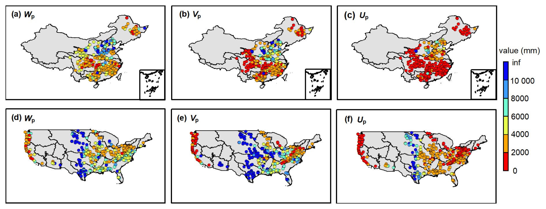We employ the MPS model to fit the relationship between mean annual available water and runoff components. In China, as shown in Fig. 4a–c, the MPS model performs well in describing runoff components variability between catchments, with R2 values of 0.86, 0.69 and 0.91 for fitting Qs, Qb and Q, respectively. The solid lines are the best-fitted MPS curves derived using the least squares fitting algorithm, implying the median values of different parameters. We also give the potential upper and lower limits of Wp, Vp and Up across catchments. Similarly, Fig. 4d–f illustrates that the MPS model achieves good fitting in the CONUS, with R2 of 0.81, 0.44 and 0.80 for fitting Qs, Qb and Q, respectively. The fitted parameters in the CONUS are smaller than those in China, while they have more comprehensive ranges between catchments, meaning a more significant heterogeneity in climate and underlying surface.