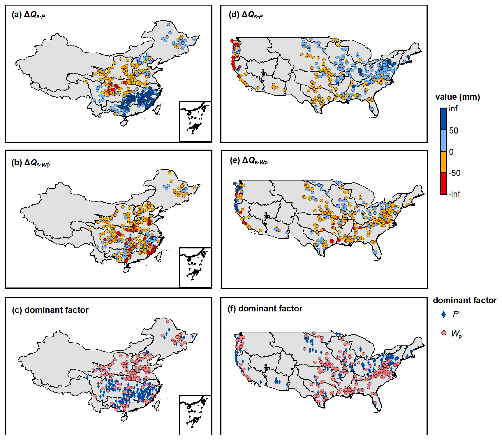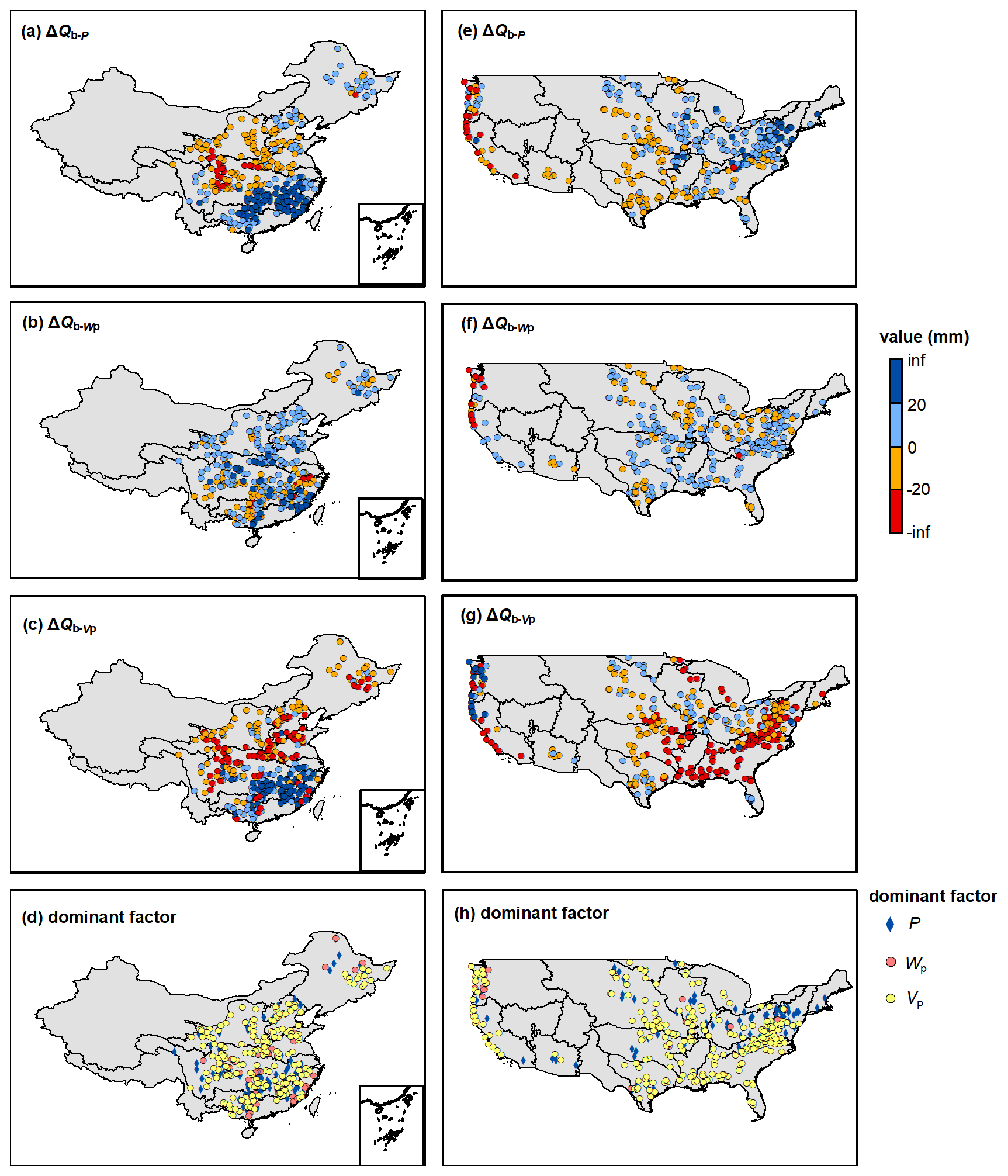 We split the data into the first period (1960–1990 in China and 1980–2000 in the CONUS) and the second period (1991–2000 in China and 2001–2014 in the CONUS) to attribute runoff components variation between two periods. Note that the attribution of ΔQ is only conducted in China because the E0 in CAMELS dataset is a constant in each catchment. In the MPS model, we consider that the runoff changes between two long-term periods are caused by available water and other environmental and anthropogenic factors (such as land cover/use change and evapotranspiration variation) encoded by parameters. For the changes of surface flow (ΔQs) and total runoff (ΔQ), postulating that each variable is independent in the MPS model, the first-order approximation of the ΔQs and ΔQ from the second period to the first period can be expressed as (Milly and Dunne, 2002):