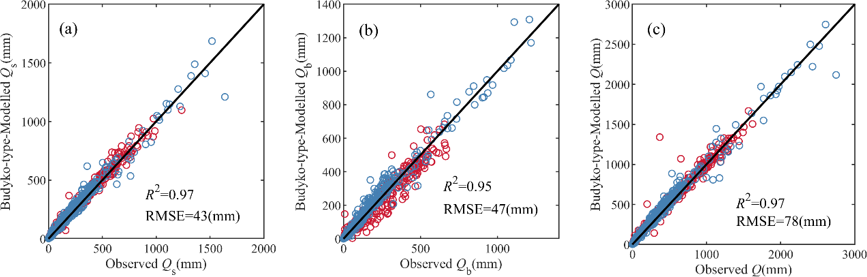 Figure 5The observed and simulated mean annual (a) surface flow, (b) baseflow and (c) total runoff by the MPS model in China (red circles) and the CONUS (blue circles).