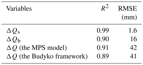 To verify the applicability of the MPS model for runoff components attribution, we compare the calculated ΔQs, ΔQb and ΔQ using Eqs. (17) and (20) with the observed ΔQs, ΔQb and ΔQ between two periods. The evaluation metrics are R2 and RMSE.