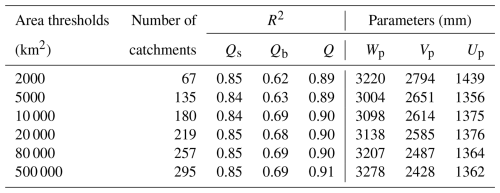 Table A1The coefficient of determination (R2) and model parameters for the MPS curve fittings under different area thresholds for selecting catchments in China.