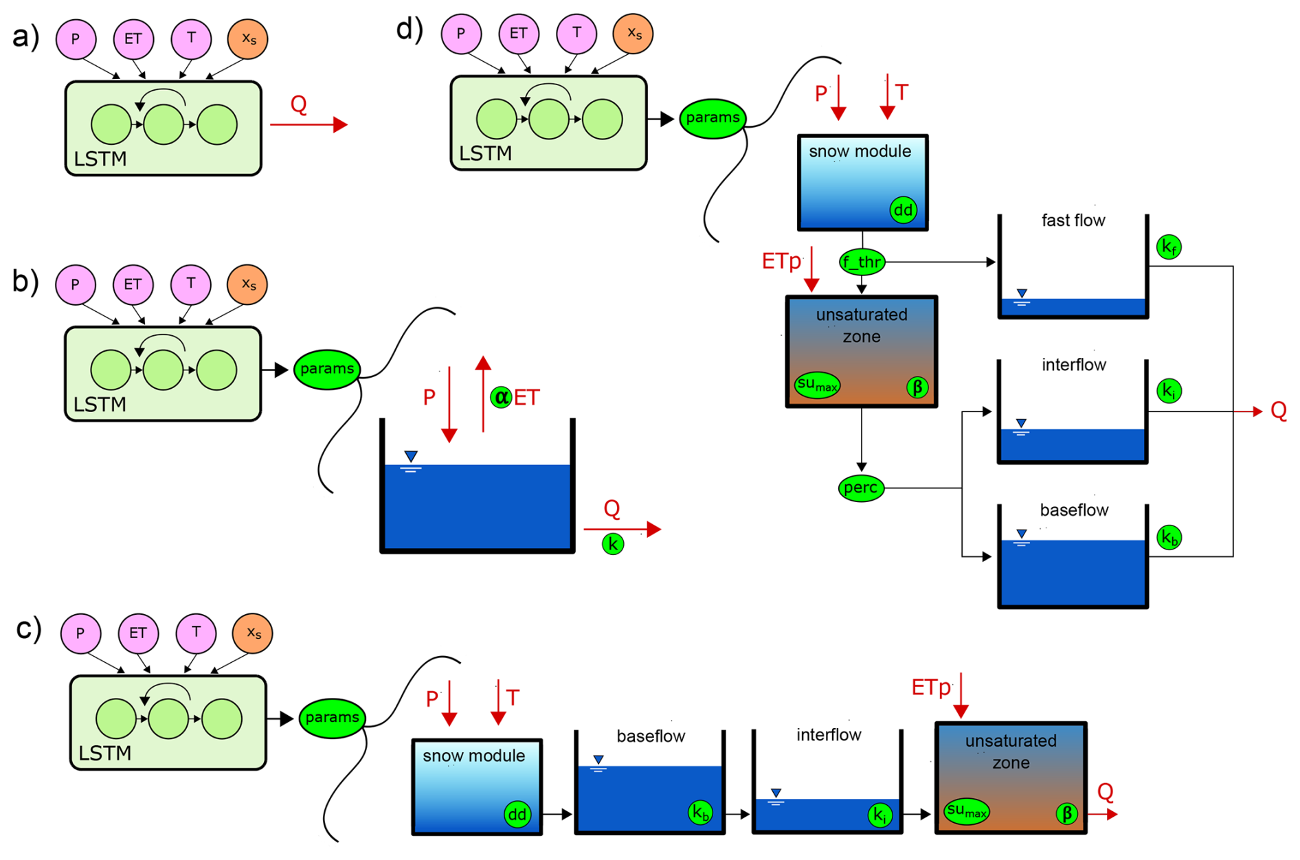 Figure 1a shows a “pure” LSTM network that serves as our baseline. Then, for each model in Fig. 1b through 1d, there is a coupling between an LSTM and a conceptual hydrological model. The model in Fig. 1d uses the Simple Hydrological Model or SHM (Ehret et al.2020) as the conceptual component, which is a simplified version of the HBV model. As an alternative, the model in Fig. 1b uses a “Bucket” model i.e. a simple conceptual model that represents the catchment water balance using a single storage. Finally, the model in Fig. 1c uses a “Nonsense” model, a conceptual model that deliberately represents processes counter to common intuition: rainfall is immediately captured and stored as baseflow storage, then moves up a soil column to the unsaturated zone before being transformed into output streamflow.