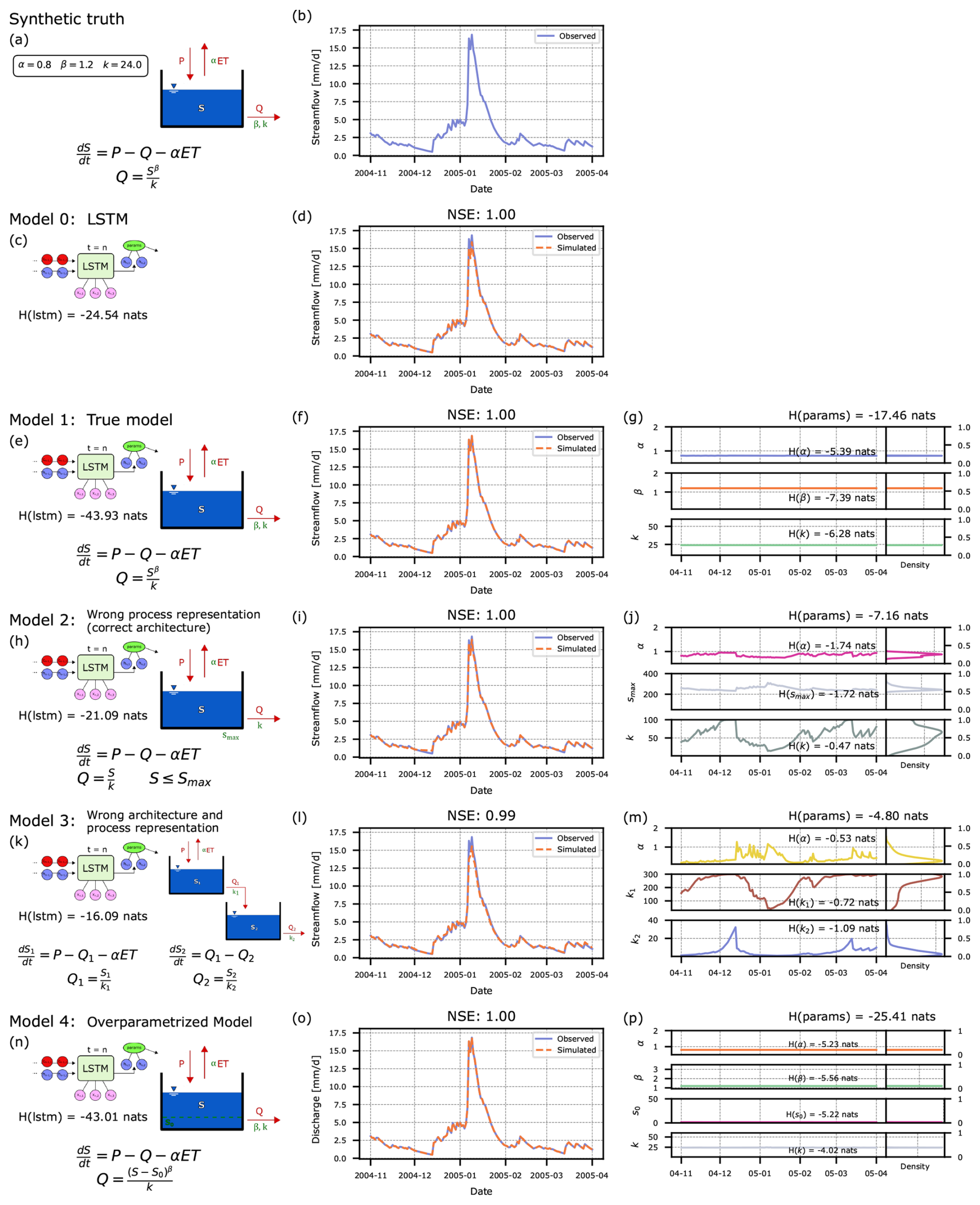 Figure 2Didactic examples, demonstrating the evaluation of hybrid hydrological models by measuring the entropy of the model parameters and the LSTM hidden-state space. Left column: Schematic illustration of hybrid model structures, with Model 1 representing the “true” conceptual physically constrained model coupled with the LSTM as a reference. Center column: Segment of observed/predicted discharge time-series. Right column: Time-series of LSTM-predicted parameters and their univariate distributions.