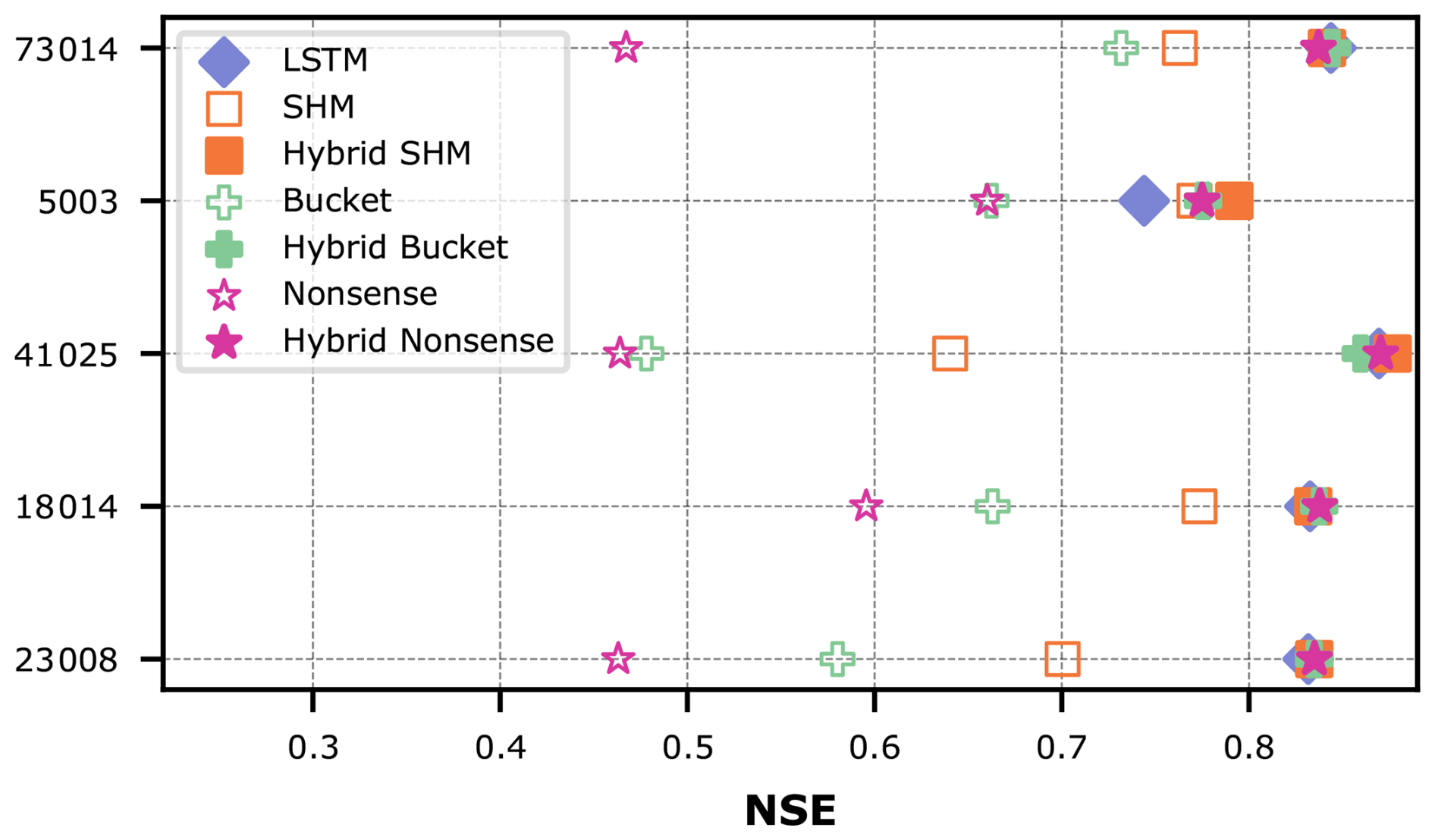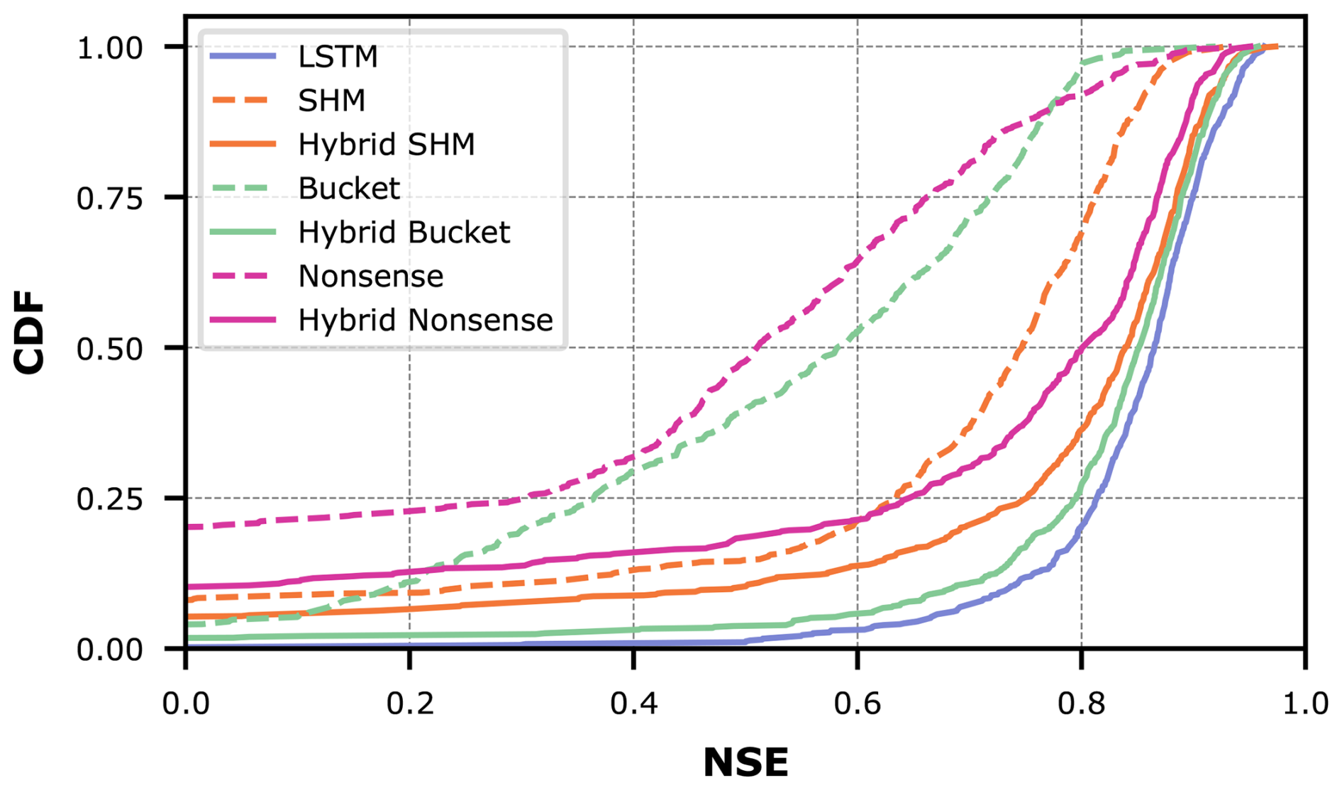 Note that we focus on a typical single-task prediction (here: streamflow) to evaluate the value of adding prior process knowledge (here: rainfall-runoff) in the form of conceptual models to an LSTM network. Yet, we recognize the potential of hybrid models for multi-task learning, where models are evaluated on multiple objectives including multiple target variables, and anticipate that our proposed method can be readily extended to such evaluations in future work.
