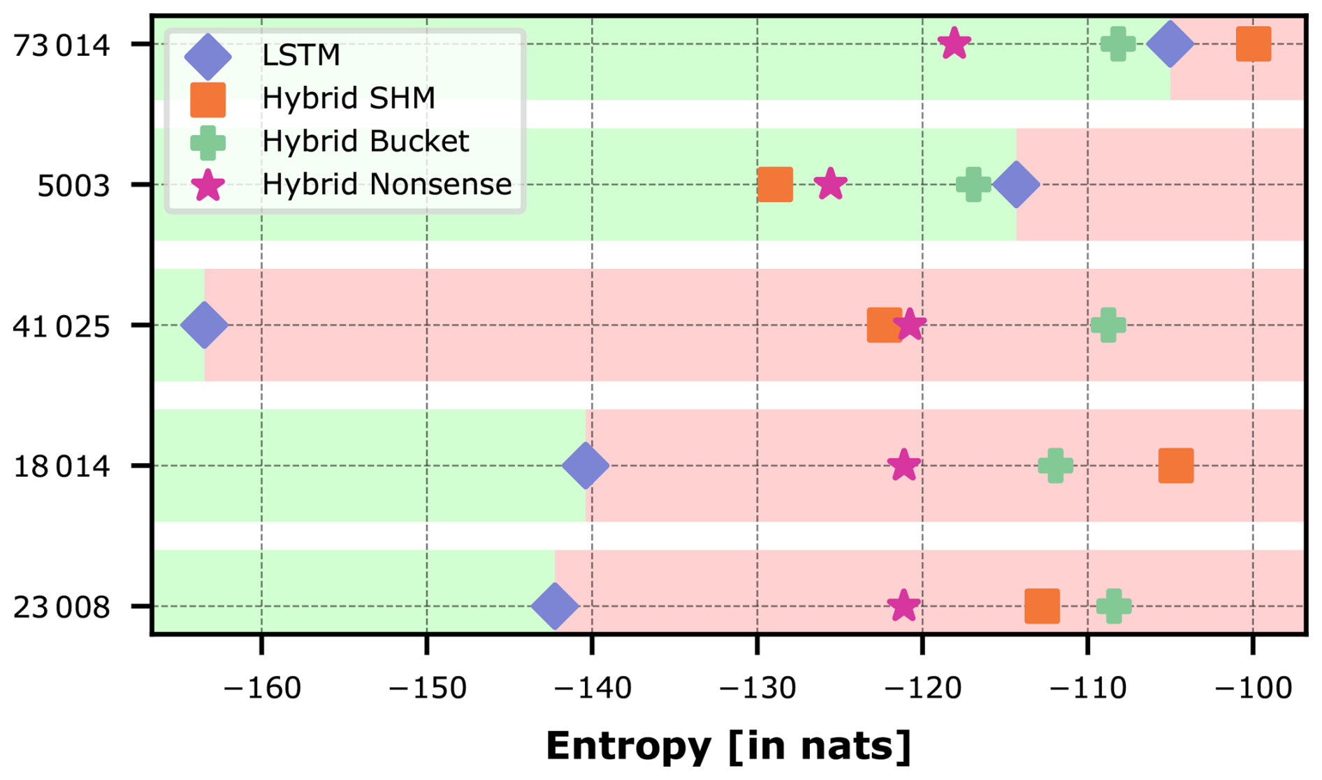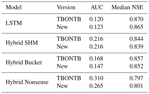 The LSTM architecture of the baseline model and the hybrid models consists of ten hidden states. For our entropy analysis of the hidden states to be meaningful and fair, it is important to compare models with the same architecture. The choice of ten hidden states was determined by the minimum required for both the baseline model and hybrid models to achieve equal performance. To aid in this process, the models were trained on a subset of five randomly selected basins (76005, 83004, 46008, 50008, and 96001) from the CAMELS-GB dataset. In general, using multiple basins improved the training process for all models, particularly for the pure LSTM (Model 0), validating current standard practices (Kratzert et al.2024). However, the purpose of this analysis was not to achieve maximum performance for a given task but to compare hybrid approaches on equal grounds. We base our entropy analysis on equal performance to ensure fair statements about the role of the conceptual component in hybrid models. Additionally, to allow for extensive repetitions and alterations, we deliberately kept the training effort low (unlike the real-world case study; see Sect. 4).