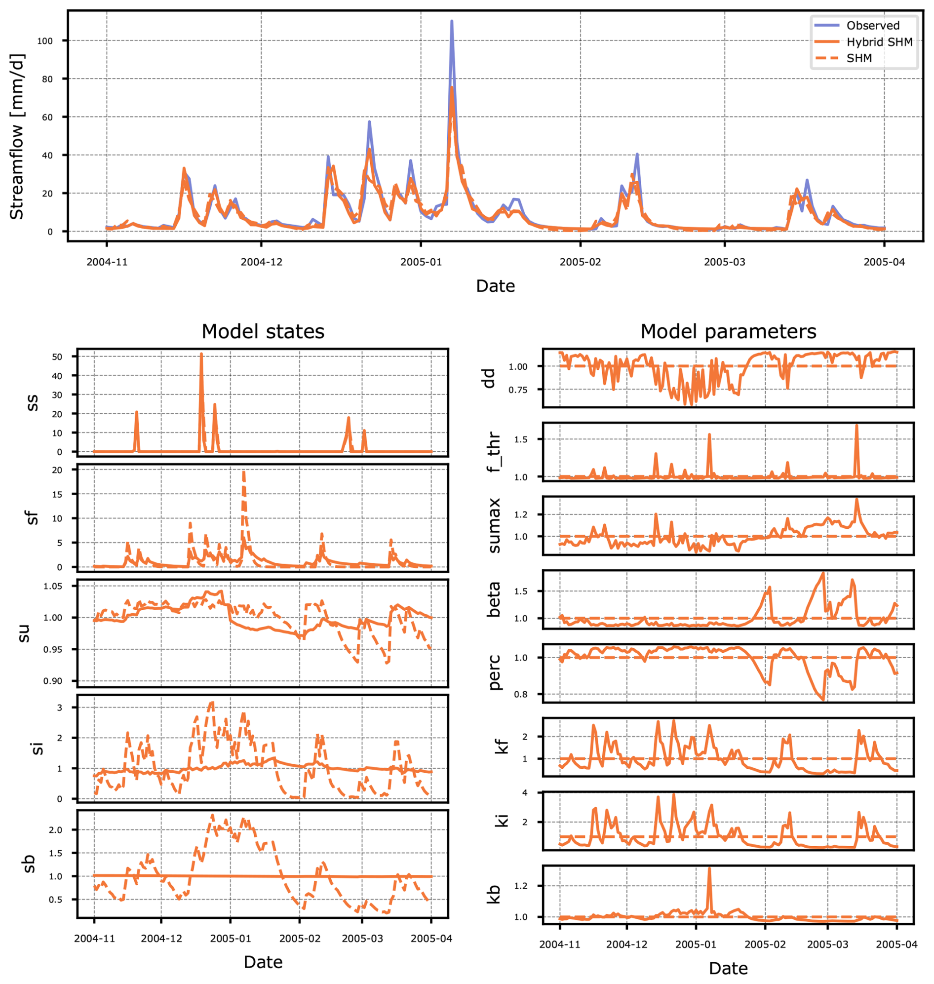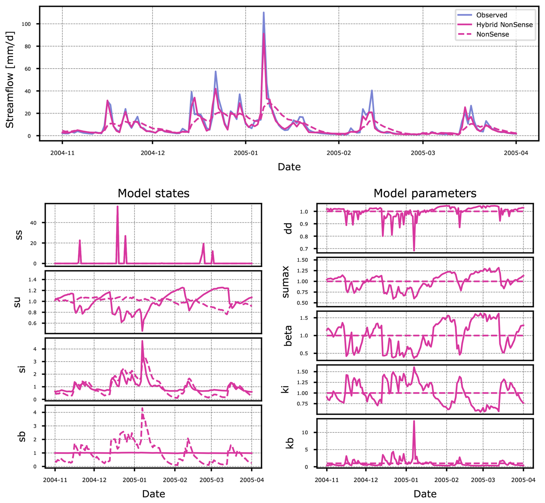 In simple terms, the approach to hybrid modeling used here can be conceptualized as a hydrological model with dynamic parameters. In rainfall-runoff modeling, the use of dynamic parameters originated with data-based mechanistic modeling (Young and Beven1994), which established methods for identifying time-invariant parameters in relation to their time-variant counterparts. More recent approaches generate time-dependent parameters by introducing stochastic processes that represent deviations from calibrated static parameters (Reichert and Mieleitner2009). In these methods, both static parameters and their variable components are jointly calibrated via Bayesian updating using Markov chain Monte Carlo. While theoretically convincing, the practical application of stochastic, time-dependent parameters has been very limited due to identifiability problems and the computational burden of propagating time-dependent parameters in a rigorous Bayesian framework (Reichert et al.2021). With the recent gain in popularity of differentiable models, the idea of dynamic parameters (albeit in a deterministic setting) has experienced a significant revival in hydrological modeling.