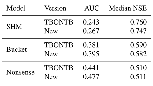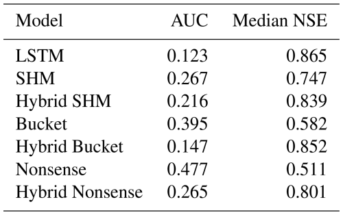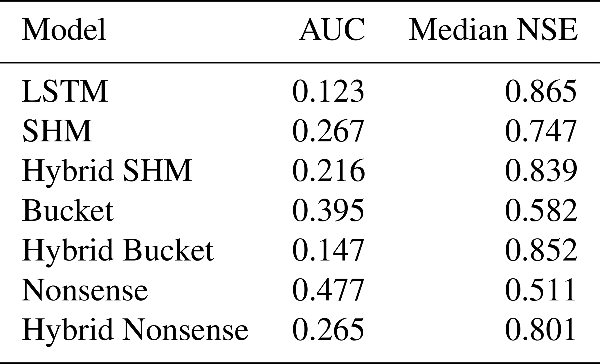 While SHM represents a model typically used in hydrological practice, the Bucket and Nonsense models serve as alternative hypotheses to test the limits of the hybrid modeling approach. These models were built using principles from modular frameworks that still find applications in hybrid modeling (Clark et al.2008; Fenicia et al.2011).