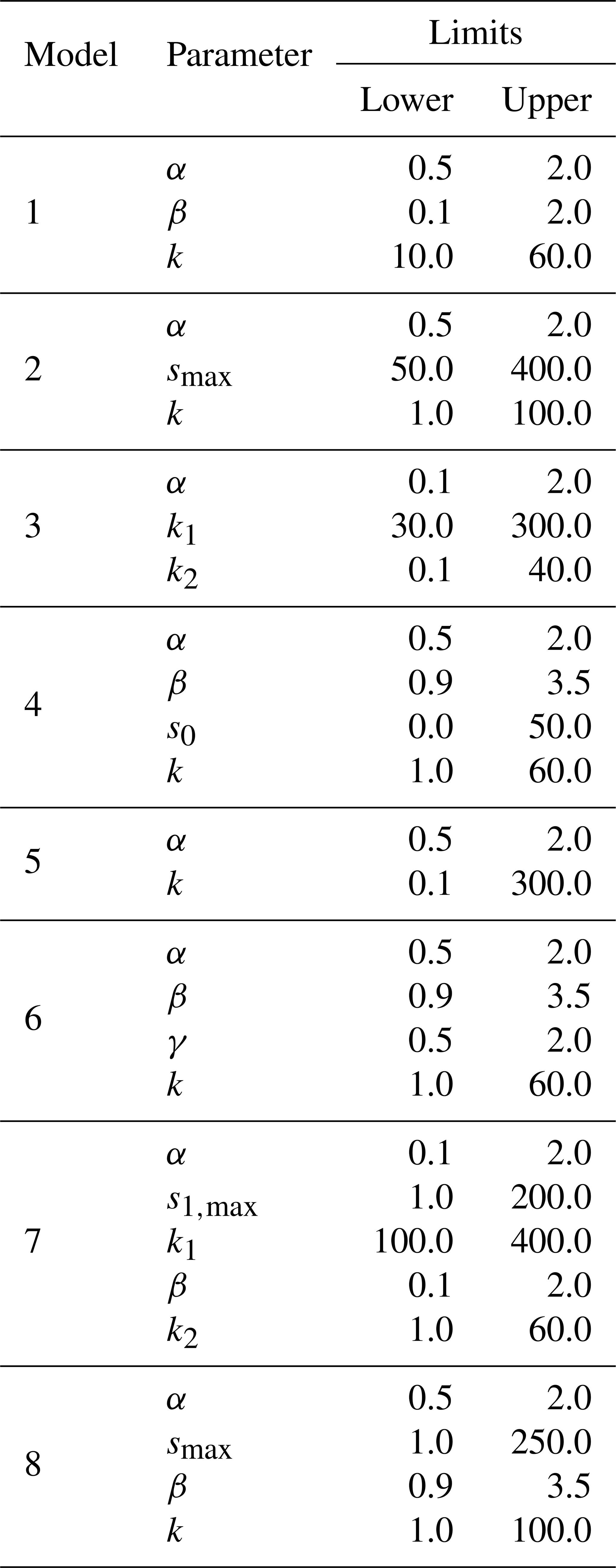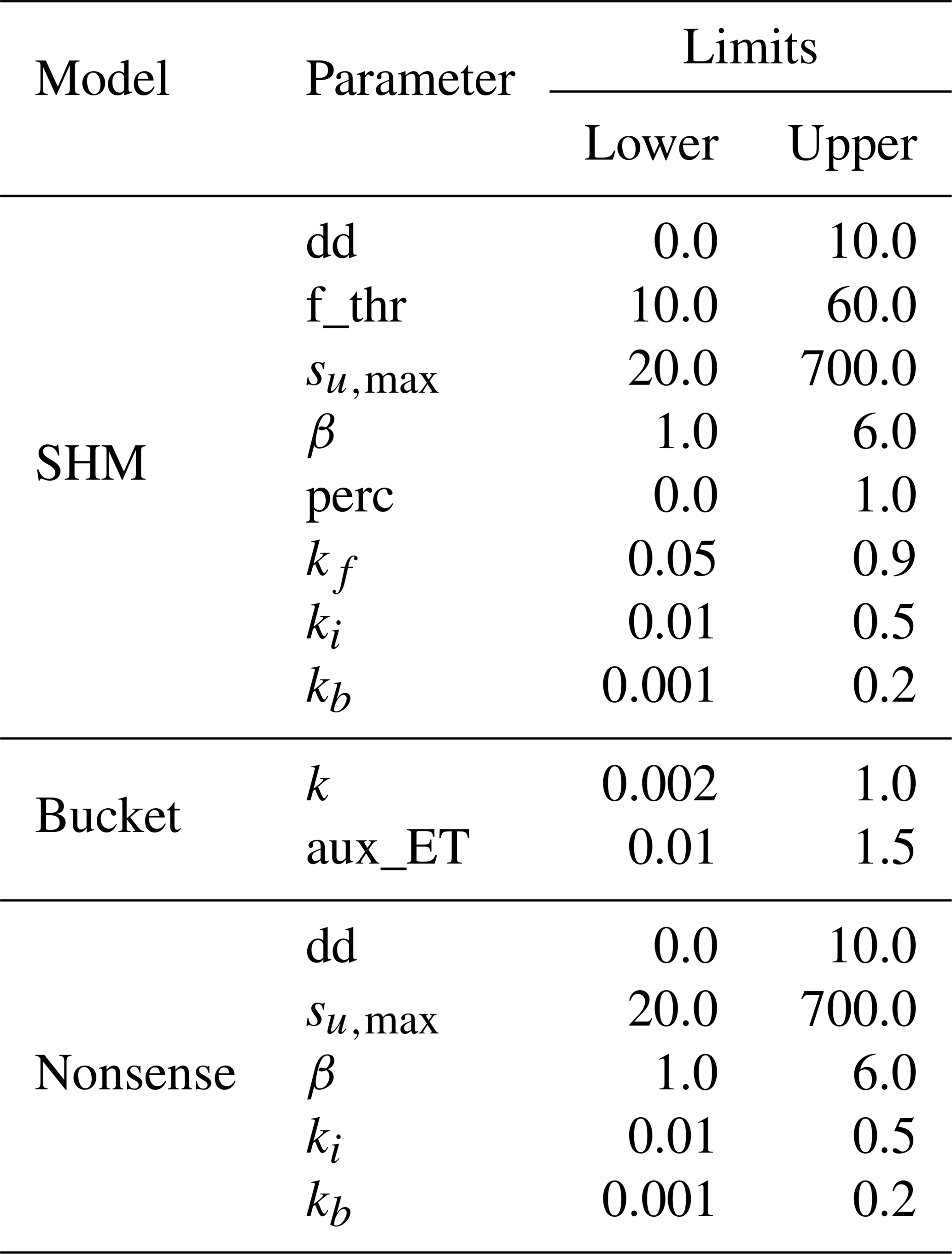 Clark, M. P., Slater, A. G., Rupp, D. E., Woods, R. A., Vrugt, J. A., Gupta, H. V., Wagener, T., and Hay, L. E.: Framework for Understanding Structural Errors (FUSE): A modular framework to diagnose differences between hydrological models, Water Resources Research, 44, https://doi.org/10.1029/2007WR006735, 2008. a, b, c