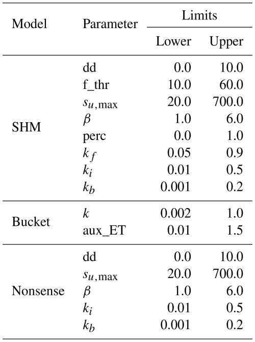 The selection of these specific basins for this example is not critical. In our true model, we have defined a data-generating process that does not consider basin-specific characteristics, meaning that the models could be trained on any set of basins. The only requirement is that basins have sufficiently long time series of precipitation and evapotranspiration data, which is satisfied by all CAMELS-GB basins. We used only the precipitation and pet time series from each basin and created our own synthetic “observed” streamflow as described in Sect. 3.1 for model training. The train/test split followed the approach detailed in Sect. 2.1. Parameter variation ranges for the conceptual model components are shown in Table A1. Since the target is the product of a model, there was no need to adjust the loss function for specific data characteristics; therefore, we chose MSE (Eq. 3) as the loss function. Each model was trained for a specific number of epochs using model-specific learning rates. We refer readers to the synthetic example logs for detailed specifications of each model. The reported testing metrics are averaged over five realizations of each model obtained from random initializations using different seeds.