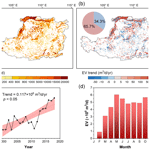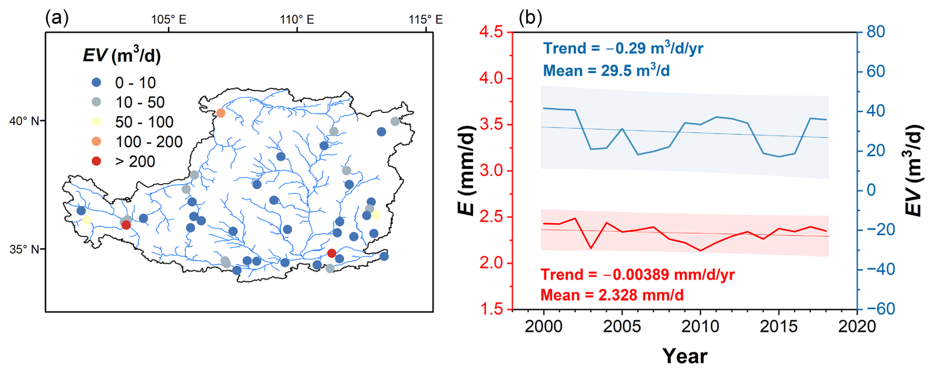 In terms of terrestrial evaporation, the Loess Plateau exhibits an average rate of approximately 1.07 mm d−1, with a statistically significant increasing trend of about 0.015 mm d−1 yr−1 observed in recent decades (Jiang et al., 2022; Peng et al., 2024). This increase in terrestrial evaporation is largely attributed to factors such as increased precipitation and extensive vegetation greening resulting from ecological restoration projects, which enhance transpiration from plants and evaporation from the soil surface. This contrasts with the dynamics of open water evaporation, which is the focus of the current study and is governed by a different set of primary drivers.
