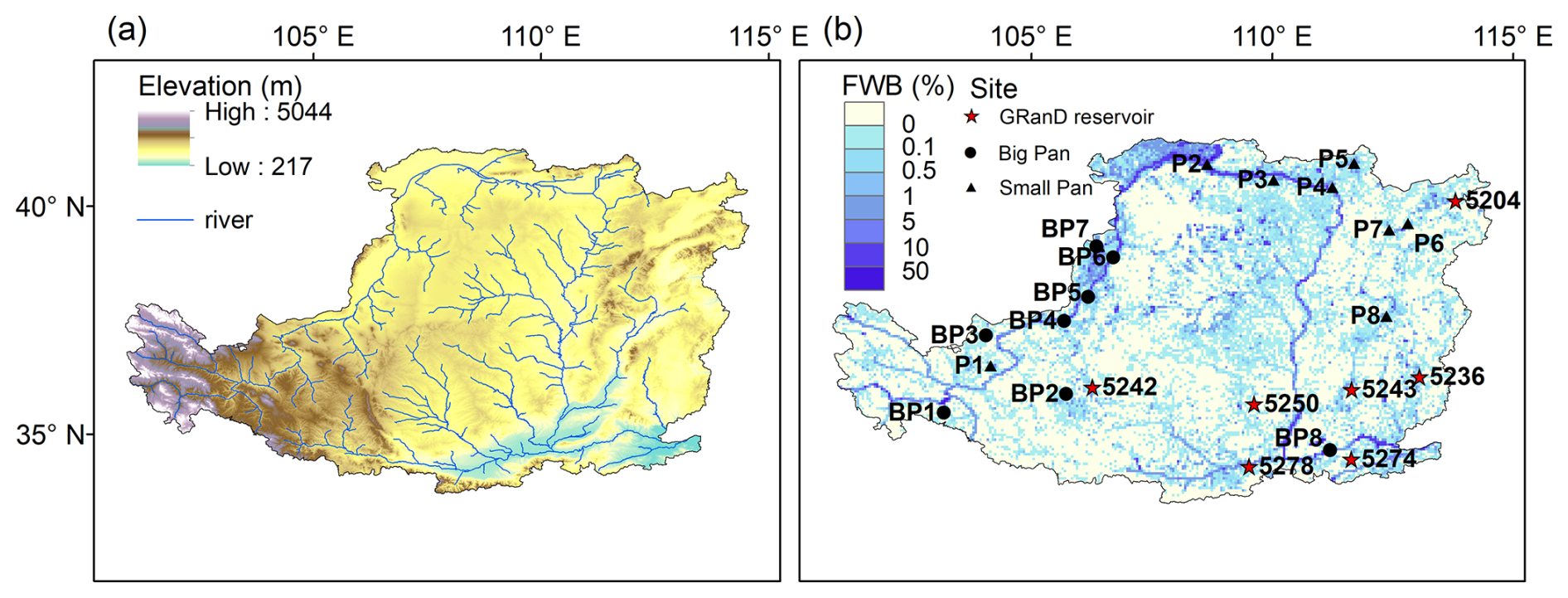 Figure 1Location of the Loess Plateau and its water body distribution: (a) elevation and river systems of the Loess Plateau; and (b) distribution of evaporation observation sites for big pan and small pan, the locations of the GRanD reservoirs used for water depth validation, and fraction of water body (FWB), representing the proportion of water body area per 0.05° grid cell, on the Loess Plateau for the long-term average of 2000–2018.