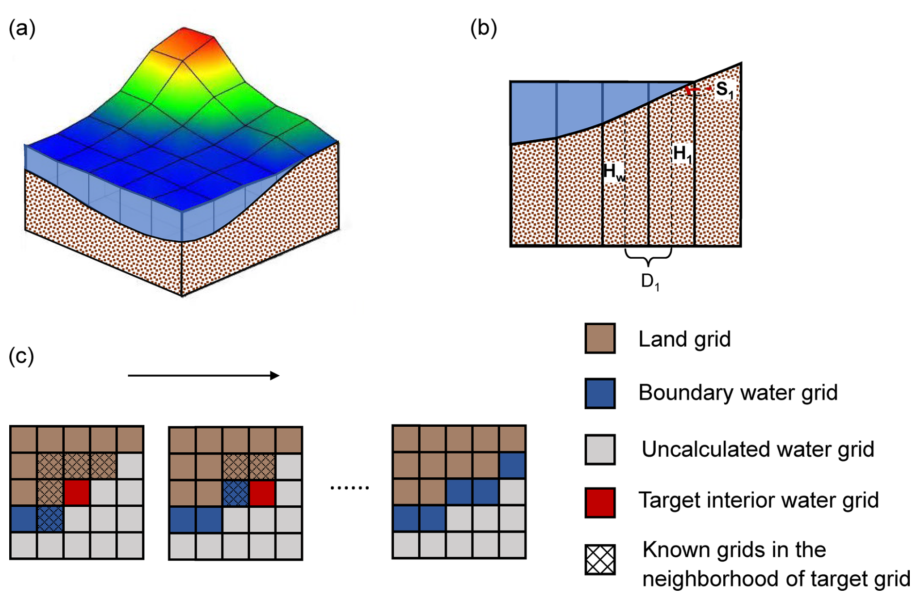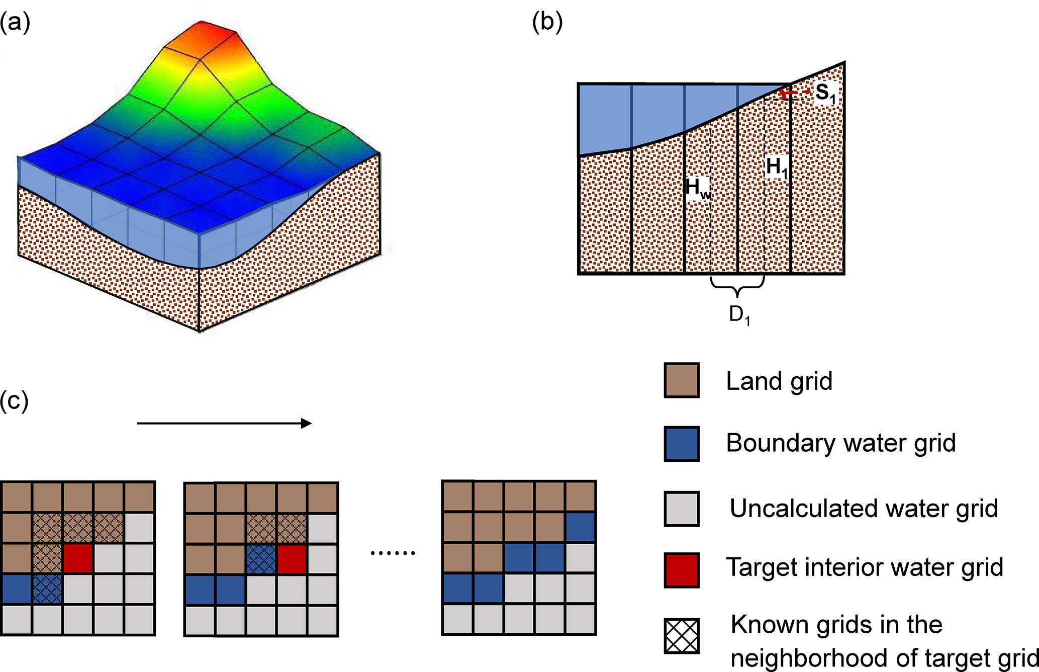 where, Hw is the water bottom elevation of a target grid cell; n is the total number of marked as known in the eight-neighborhood; Hi is the ith elevation value of the water body boundary or the already calculated elevation value of the water grid; Si is the slope of the ith grid; Di is the distance from the ith grid to the target water grid. The calculation for water body grid follows the rule of starting from the nearest grids to the water body boundary and progressing to the farthest ones.