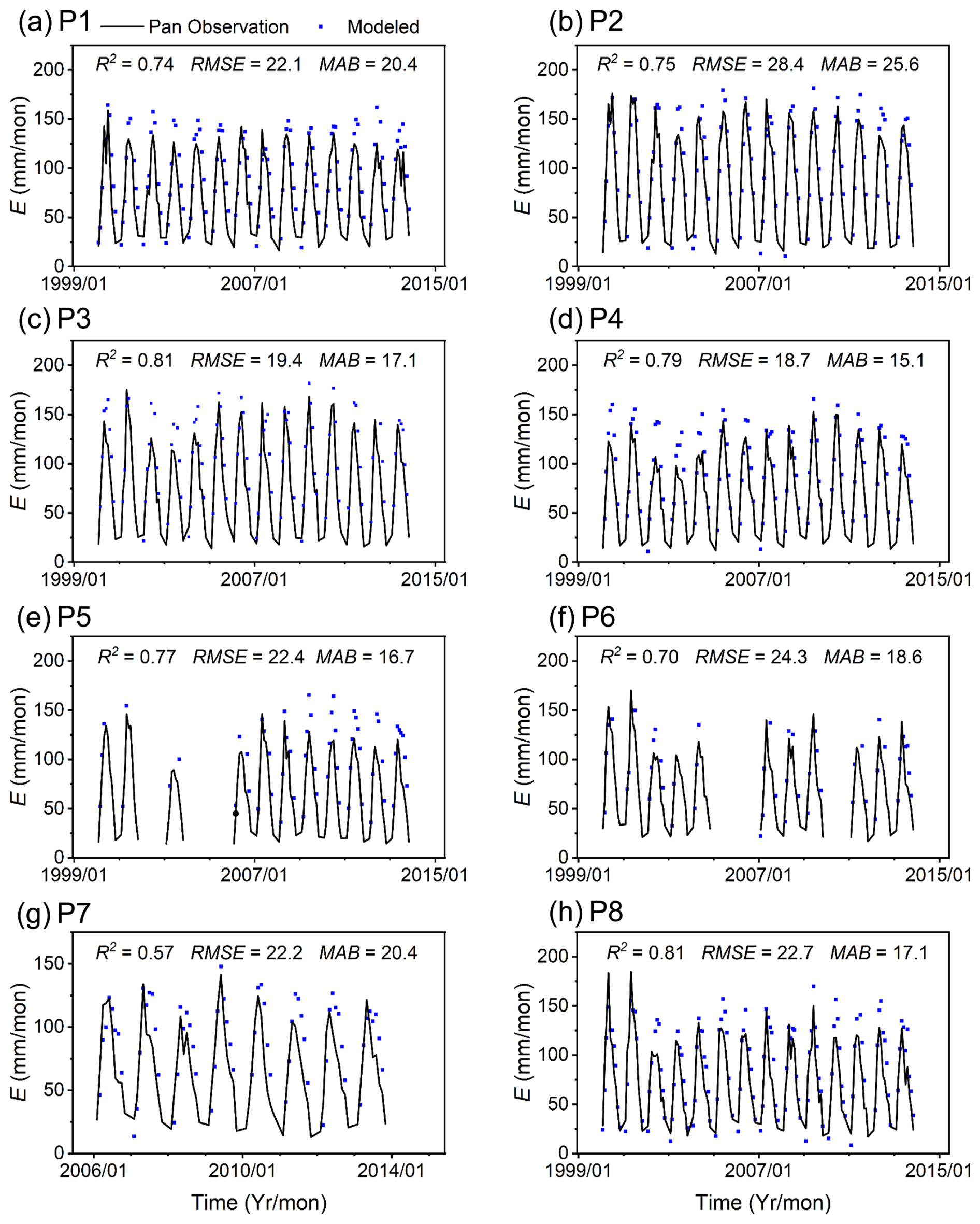 Figure 3 illustrates a comparison between the estimated evaporation rates from water bodies and the observations from the small-pan evaporation. The evaporation estimates exhibit a strong agreement with the observations, capturing the monthly dynamic changes. The average coefficient of determination (R2) for this comparison is 0.75, indicating a robust correlation (Fig. 5a). The average MAB is generally less than 20 mm per month, and the average RMSE stands at approximately 22.54 mm per month (Fig. 5b, c). However, at certain stations, such as station P1, the modified Penman equation slightly overestimates peak evaporation values. Nevertheless, the overall alignment is deemed acceptable.