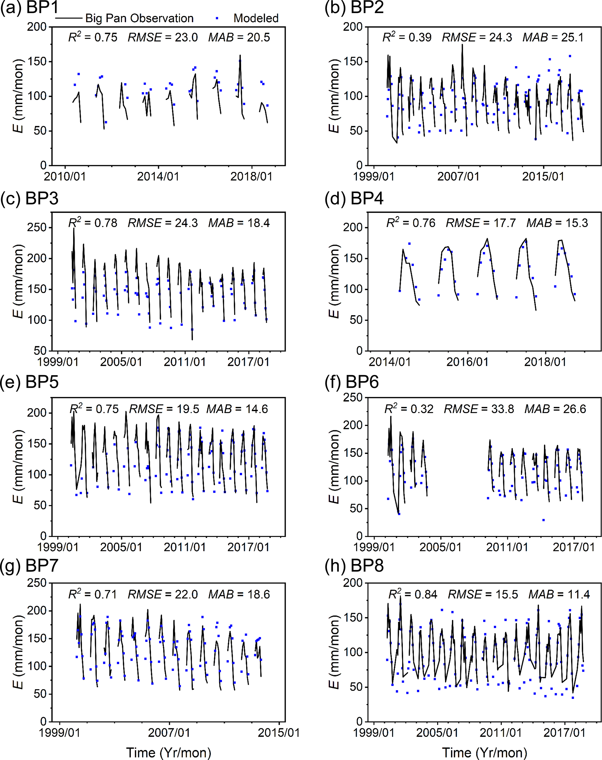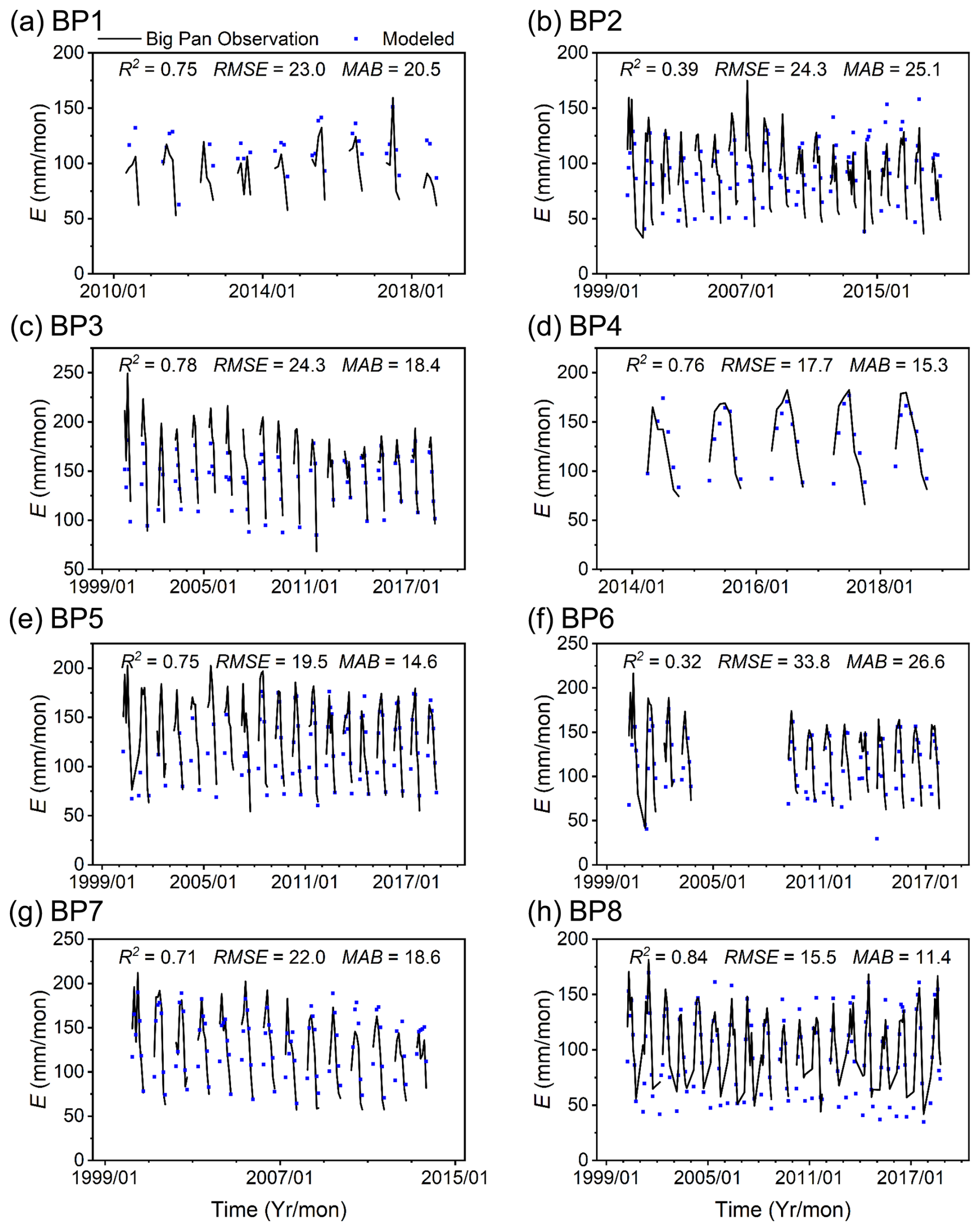 Figure 4 provides a comparison between the estimated evaporation rates and the observations recorded by big pans. Specifically, the performance metrics for the big-pan observations are comparable to those from the small pans. The average MAB for the big pans is 18.82 mm per month and the average RMSE is 22.50 mm per month, both very similar to the small pan validation results. While the average R2 is lower for big pans (0.66) compared to small pans (0.75), the overall results from both validation observations affirm the model's capability to capture the temporal dynamics of evaporation.