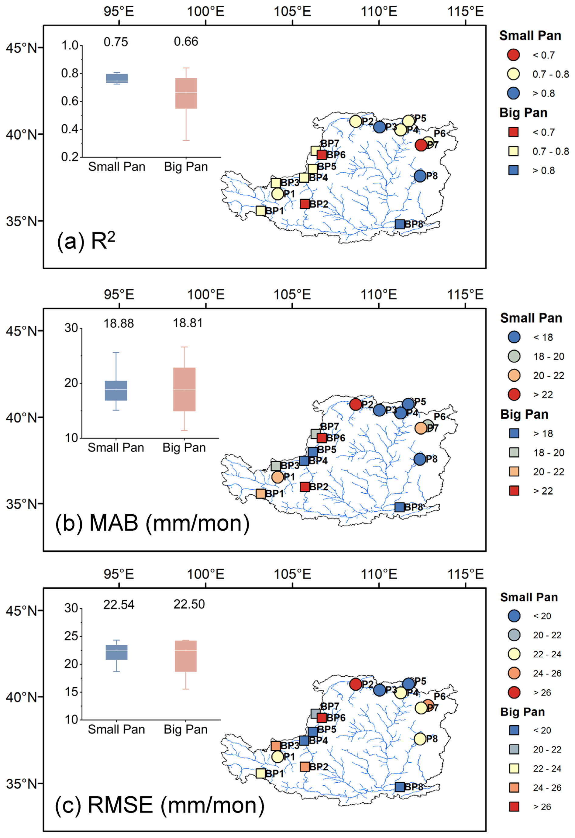 Figure 5The spatial distribution and box plots of the three validation metrics (a) R2, (b) MAB, and (c) RMSE for simulated evaporations compared to observations from small and big pans. Values represent the average for R2, RMSE, and MAB.