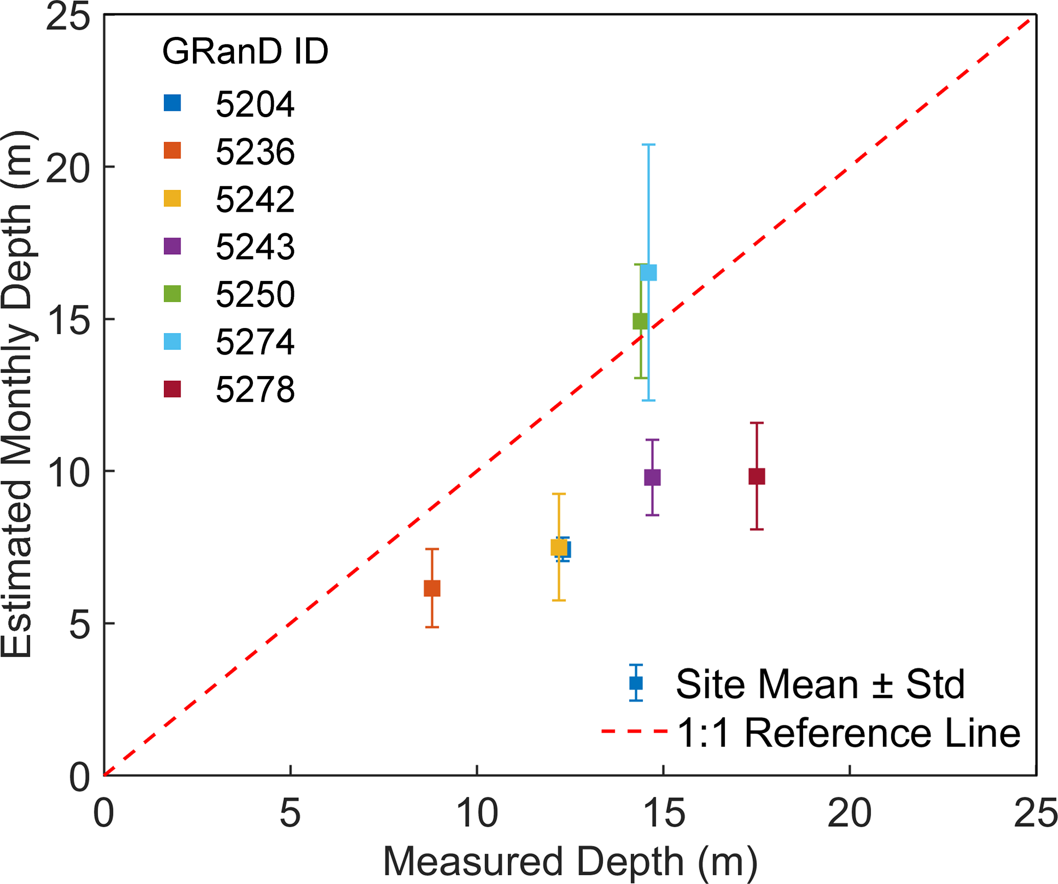 Figure 6Water depth estimation against measured depth. The measured depths are static values from the GRanD database. Error bars on the estimated depths represent the standard deviation of the dynamic monthly estimates. The red dashed line indicates the 1:1 reference.