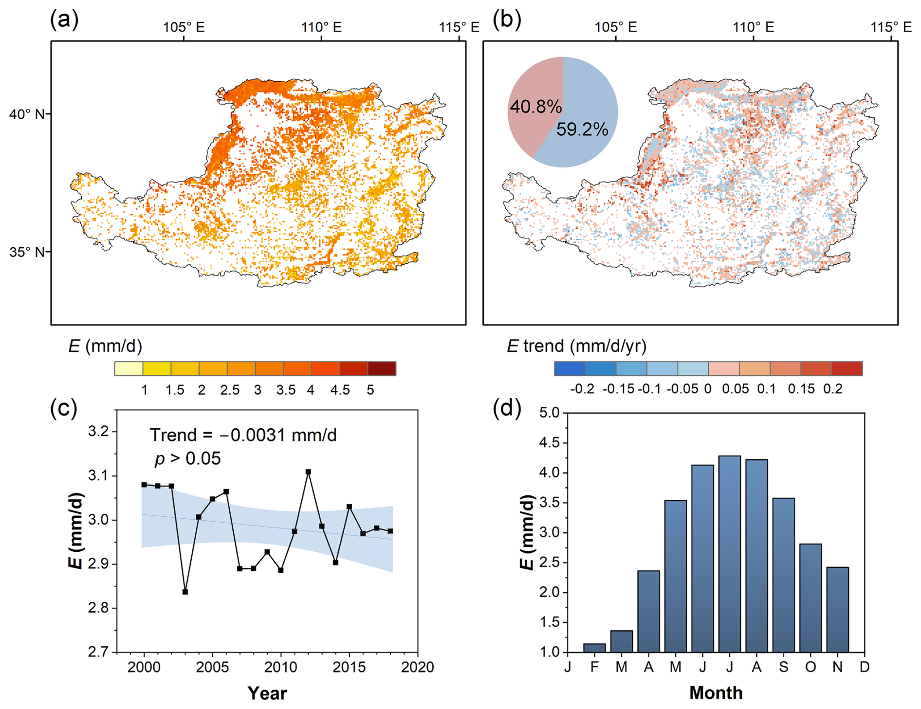Figure 7Spatiotemporal patterns of open water evaporation rate (E) over the Loess Plateau (2000–2018): (a) Spatial distribution of long-term average E (mm d−1); (b) Spatial distribution of temporal trends in E (mm d−1 yr−1); (c) Interannual variability of averaged E, with the shaded area representing the 95 % confidence interval; and (d) Mean monthly climatology of averaged E for the Loess Plateau. The inset pie chart in (b) shows the water area percentage of positive and negative trends.