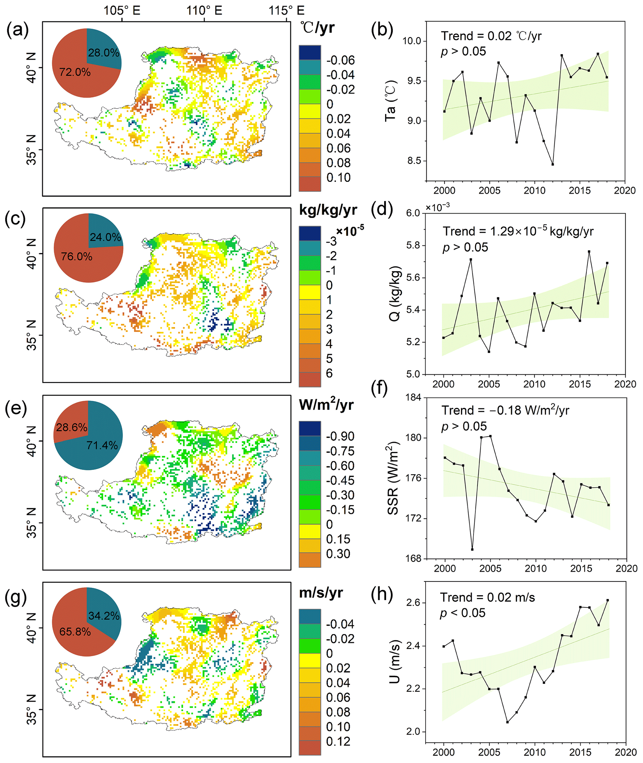 Evaporation from water bodies across the Loess Plateau presents pronounced geographical heterogeneity. The spatial distribution of evaporation exhibits a gradual decrease from the northwest to the southeast, as depicted in Fig. 7a. The long-term average evaporation rates vary between 2.8 and 3.1 mm d−1, with certain areas in the northwest exceeding 5 mm d−1. Temporal changes in evaporation, however, do not follow a discernible trend and appear relatively decentralized, as illustrated in Fig. 7b. Despite this, areas experiencing decreasing evaporation are slightly more extensive than those with increasing evaporation (59.2 % vs. 40.8 %). Notably, regions with significant increases in evaporation rates (p<0.05) are concentrated in the western and north-central Loess Plateau. This spatial pattern suggests that the trends are likely driven by changes in localized meteorological factors and water body characteristics.