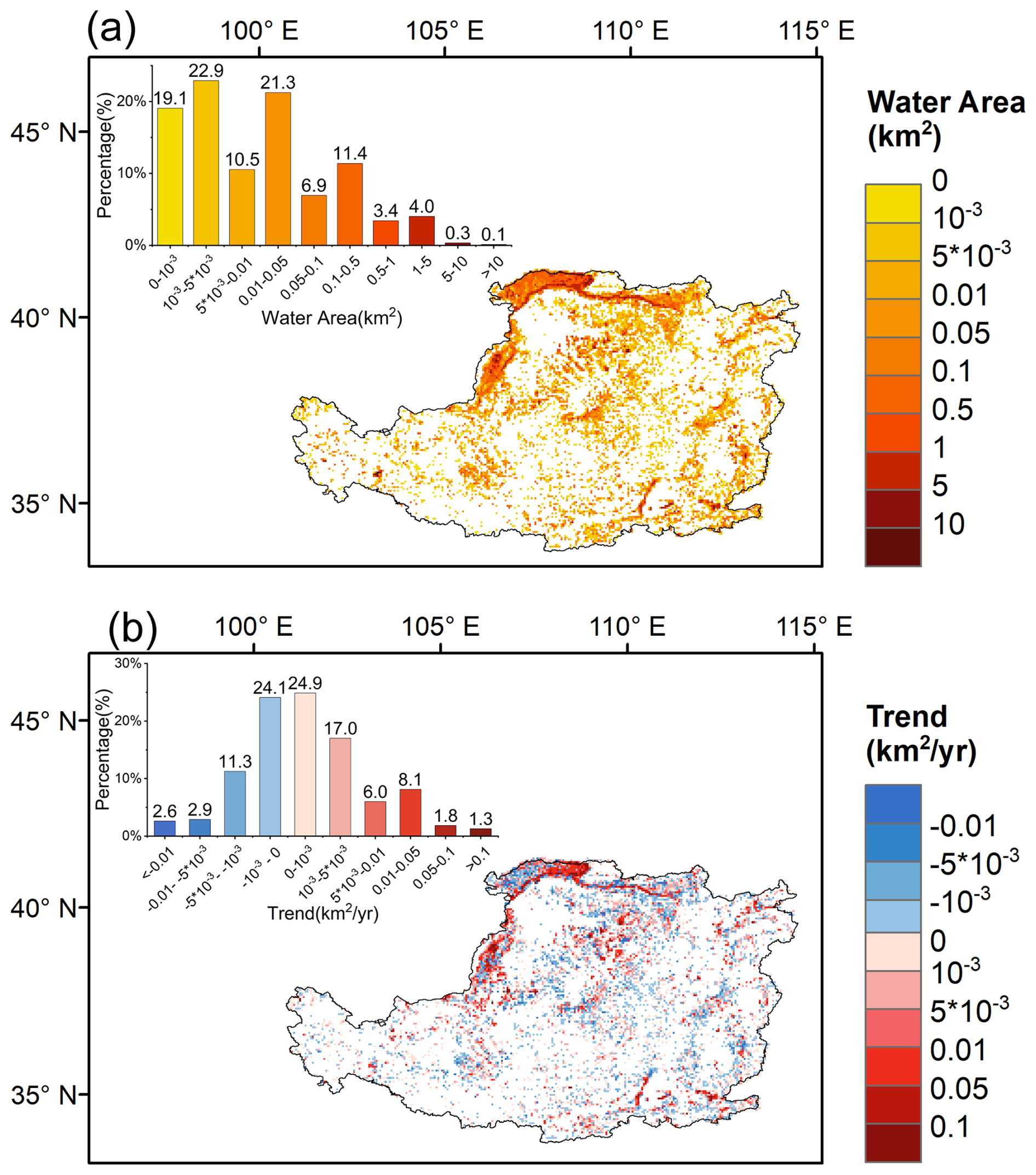 Characterized by its loose soil structure, the Loess Plateau is highly susceptible to severe soil erosion due to wind and water (Jiang et al., 2019; Zhao et al., 2013). In order to retain soil and sediment and to reduce the amount of sediment load to the main channel, a large amount of small-scale check dams have been constructed within gullies and small tributaries on the Loess Plateau after 2000 (Wang et al., 2021; Zhang et al., 2022). Driven by the economic development of agriculture, industry, and various sectors, there has been a heightened demand for water resources. Consequently, hydraulic infrastructure including reservoirs, has been continuously expanding. Permanent water bodies on the Loess Plateau grew from 1200 km2 in 2000 to 2200 km2 in 2020, and the number of small water bodies has increased from 6721 to 14 082 (Liu et al., 2023). Furthermore, there is a widespread distribution of agricultural irrigation districts in the western and northern regions of the Loess Plateau, e.g., Ningxia Irrigation District and Hetao Irrigation District (Zhang et al., 2019b). All of these factors collectively influence the fraction of surface water bodies on the Loess Plateau (Fig. 1b).