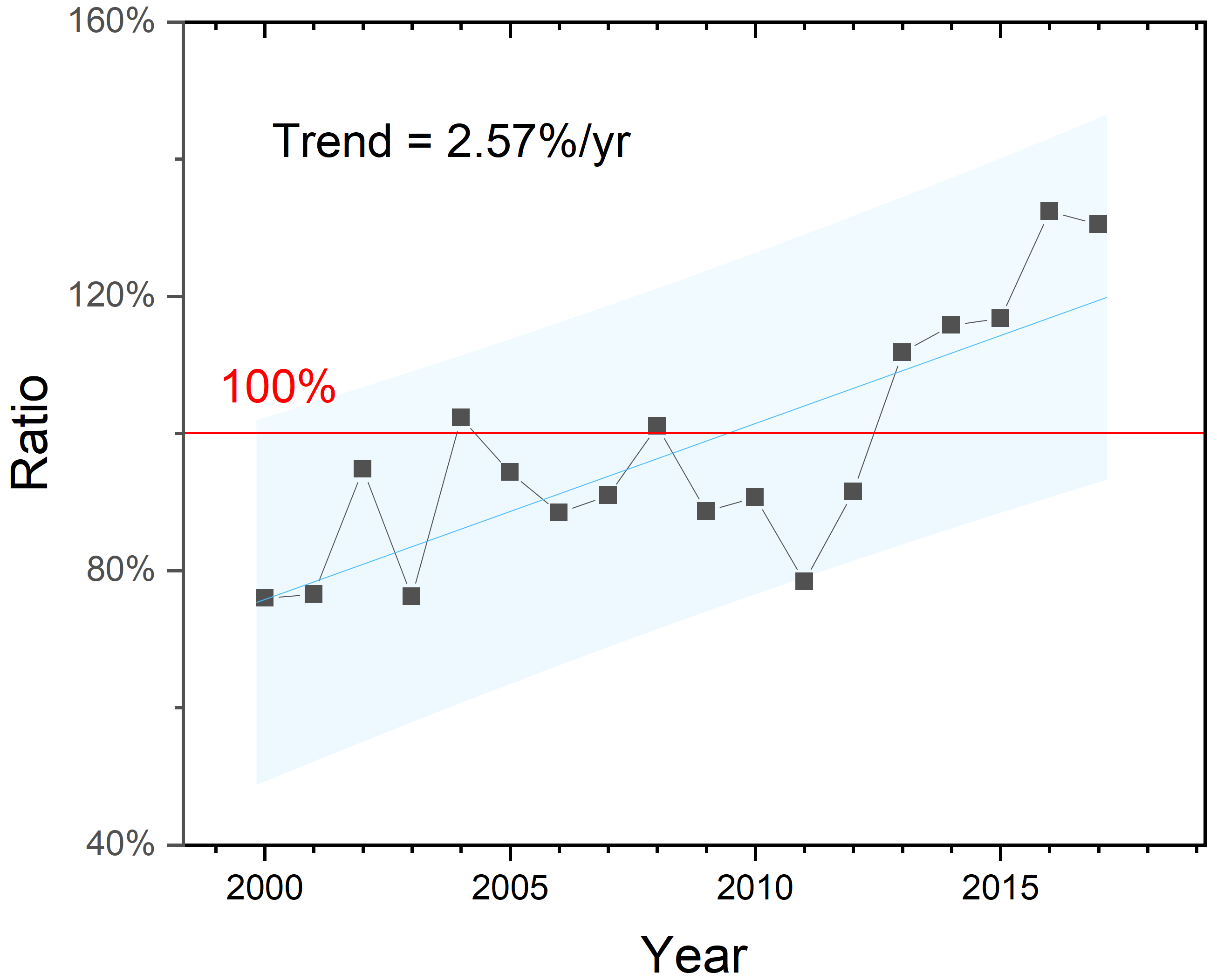 where Yi is a year from 2000 to 2018, FYi,m is the monthly-scale forcing variable for the year Yi and month m after detrend, FYi,m is the original monthly-scale forcing variable; FYi is the annual average variable for the year Yi; Yb is the reference year in 2000, and a is the trend in the annual average meteorological variable or the water area. This equation is able to remove the annual trend but preserve the seasonal variation.