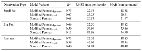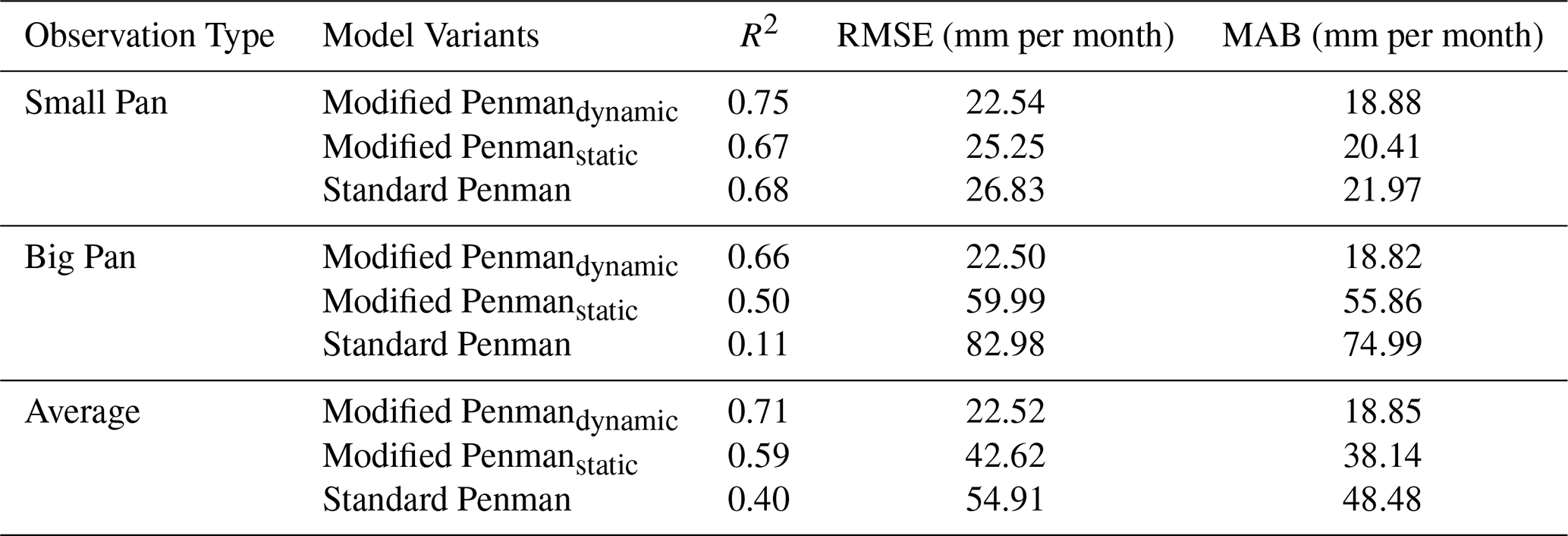 Table 1Evaporation estimation performance of the Penman model with different water depth consideration. Values represent the average for R2, RMSE, and MAB.