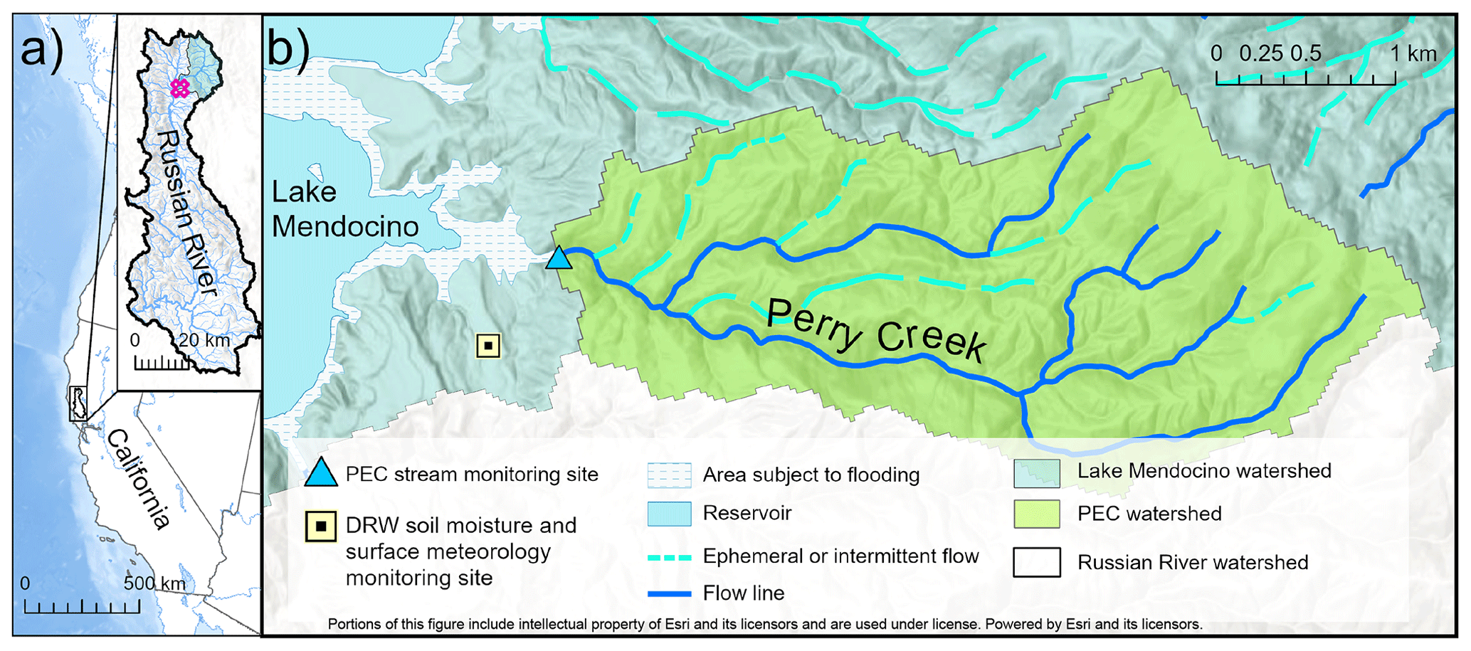 Figure 1The Perry Creek (PEC) study site in the upper Russian River’s Lake Mendocino watershed, California, US. (a) The location of the Russian River watershed (inset); the pink polygon shows the location of the study area shown in (b). (b) Perry Creek watershed and the Center for Western Weather and Water Extremes (CW3E) monitoring sites: the stream monitoring site at Perry Creek (PEC), the soil moisture and surface meteorology site at Deerwood (DRW), and associated hydrologic features (legend). Image data sources: CW3E and National Hydrography Dataset Plus (NHDPlus) High Resolution (Moore et al., 2019; Esri).