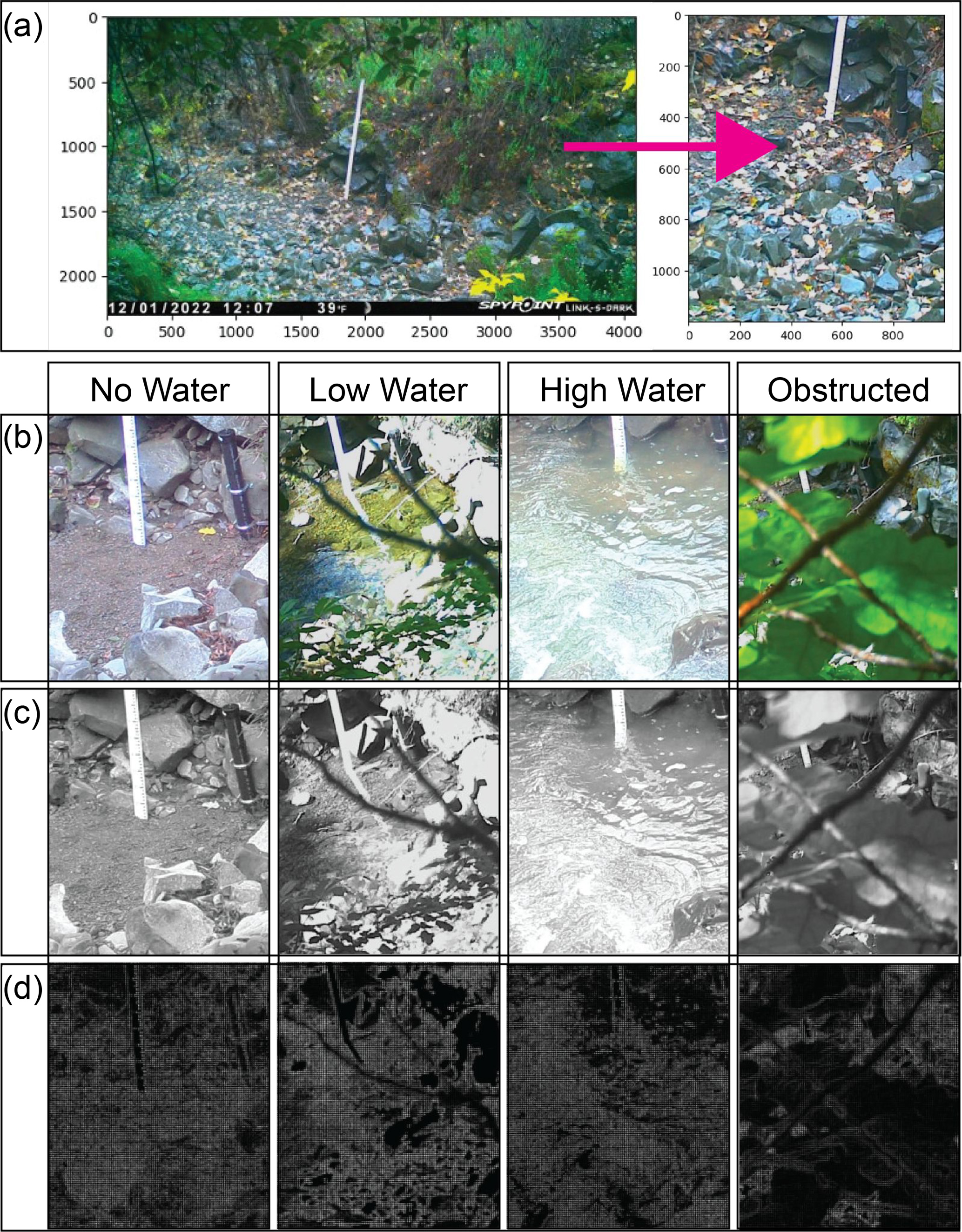 Figure 3Examples of imagery preparation steps for example field camera images. (a) Spypoint Link S Dark image for Perry Creek (PEC) from 1 December 2022, during a “no water” period; the image is cropped to center on the staff plate and set to a size of 1000×1200 pixels. (b) The four categories of labels for field camera images, showing each water level condition: “No Water”, “Low Water”, “High Water”, and “Obstructed”. (c) Examples of the grayscale conversion of (b). (d) The corresponding visualization of the histogram of oriented gradients (HOG) transformations of (c).