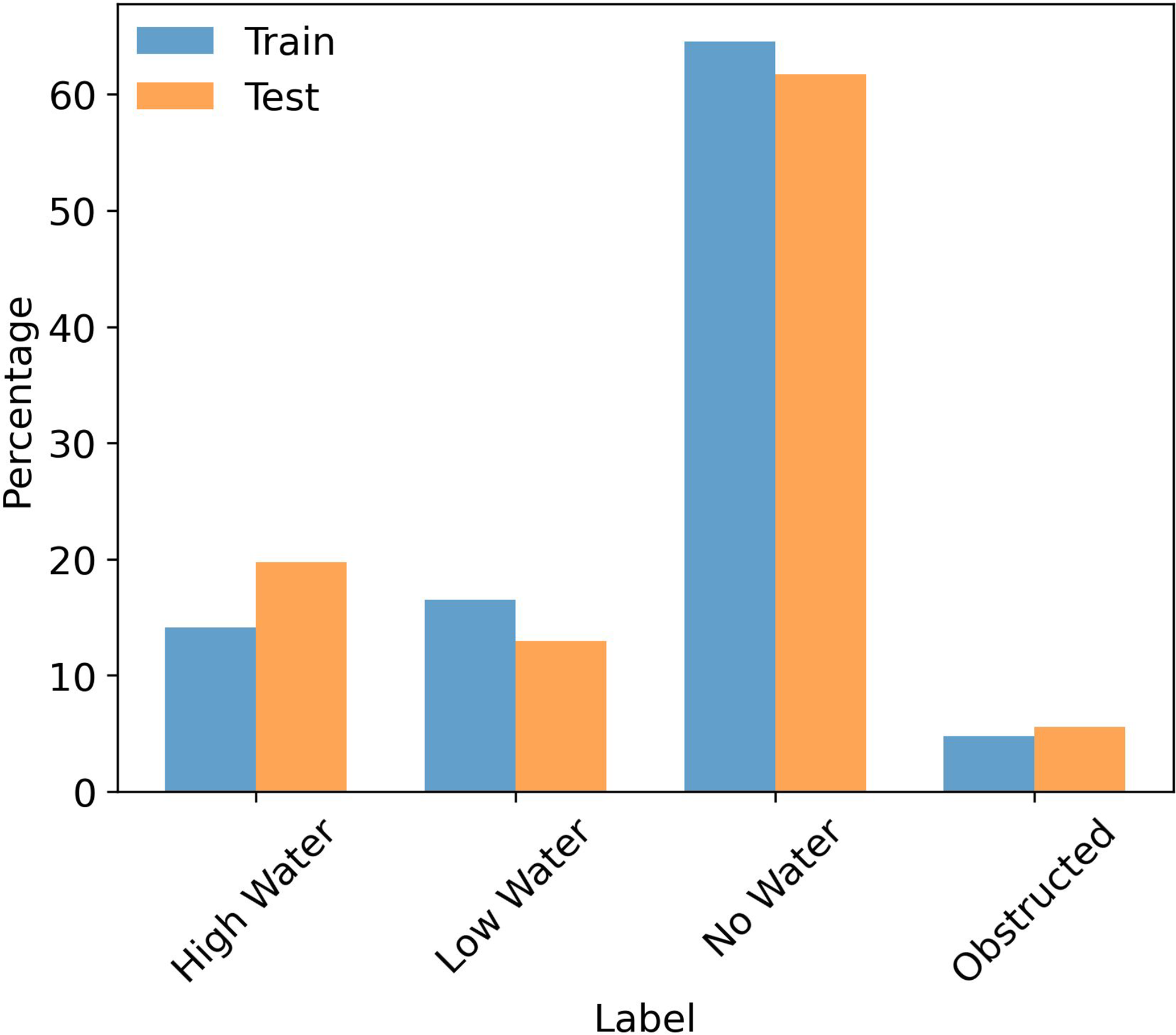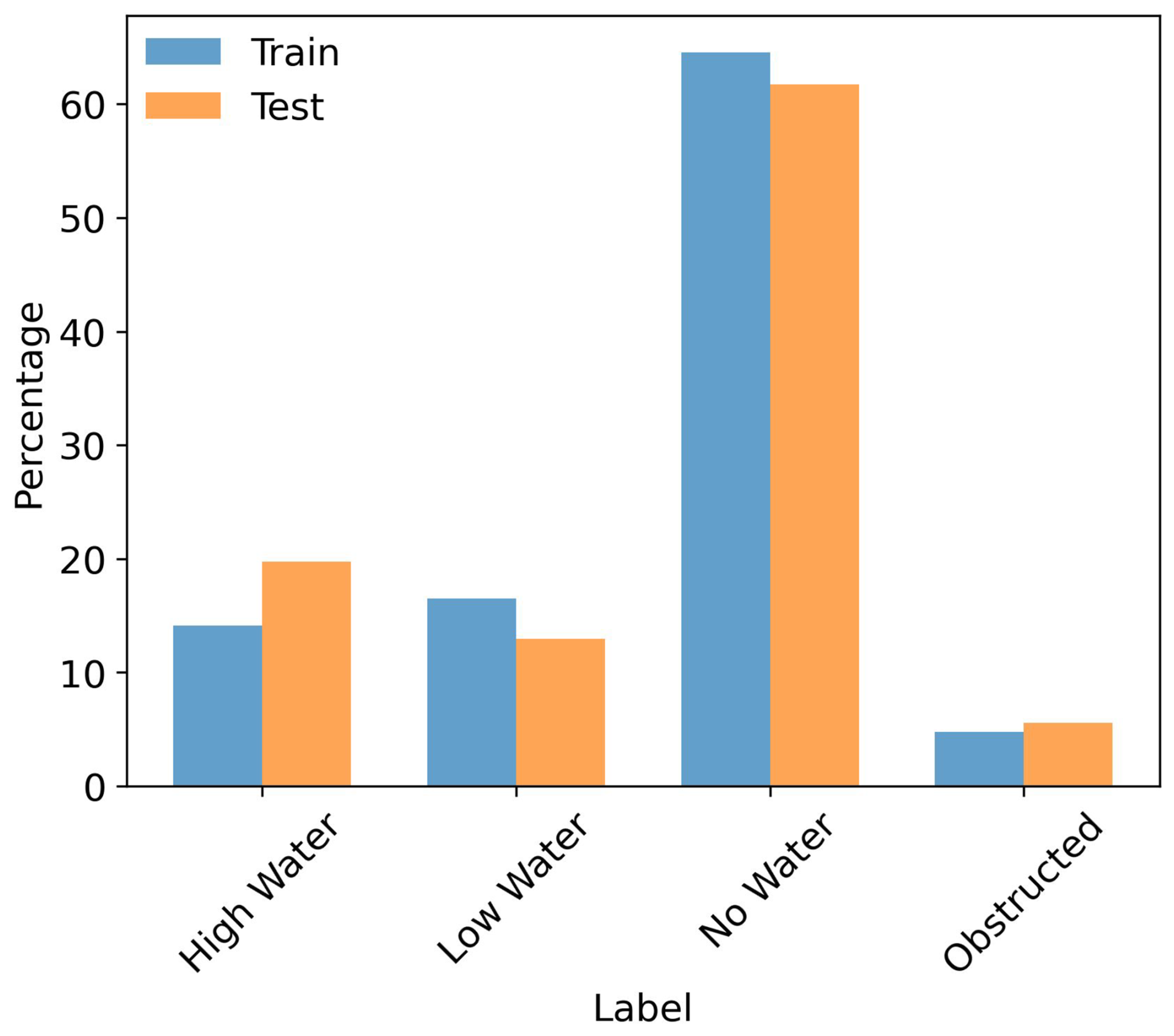 Figure 4Percentage (vertical axis) of labeled Perry Creek field camera images within each of the final model run's training (70 %) and testing (30 %) set split (colors) according to the label category (horizontal axis).