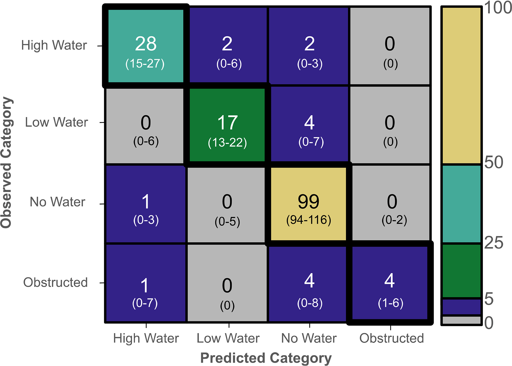 Each of the n test-set image classifications falls into one of four categories: “no water”, “low water”, “high water”, or “obstructed”. For each category, the classification outcome is recorded as true positive (TP), false negative (FN), false positive (FP), or true negative (TN). Consider the “no water” category as an example. If a test-set image labeled as “no water” is correctly classified as “no water”, it is recorded as a TP; if misclassified as “low water”, “high water”, or “obstructed”, it is a FN. In contrast, if a different image labeled as anything other than “no water” is classified as “no water”, it is a FP; if classified correctly as any category other than “no water”, it is a TN. We used a confusion matrix to assess these outcomes.