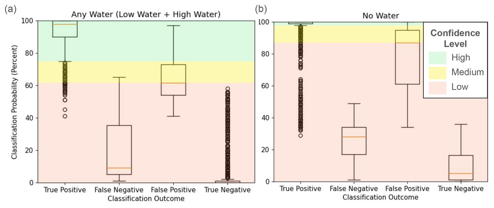 Figure 6The distribution of classification probabilities from the 20 runs of the best-performing model configuration evaluated on test set images. The panels show classification probabilities (vertical axis) across true positive, false negative, false positive, and true negative classification outcomes (horizontal axis) for: (a) “any water” (“low water” or “high water”) classifications and (b) “no water” classifications. The colors indicate the probability ranges used to assign high (green), medium (yellow), and low (red) confidence to image classifications. The boxplots show the interquartile range (IQR; box), median (orange line), the upper/lower quartile ±1.5 ⋅ IQR (whiskers), and outliers (points).