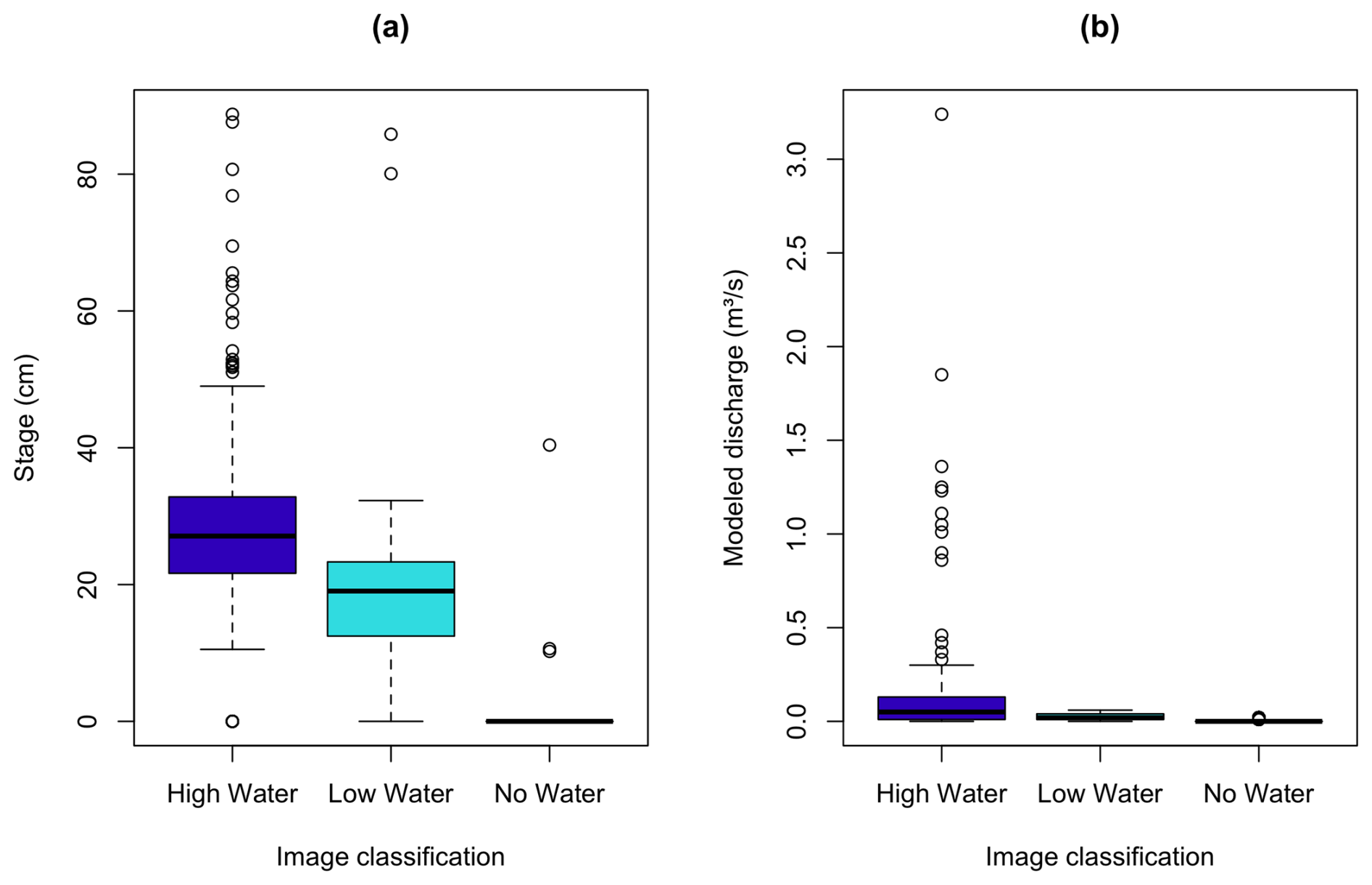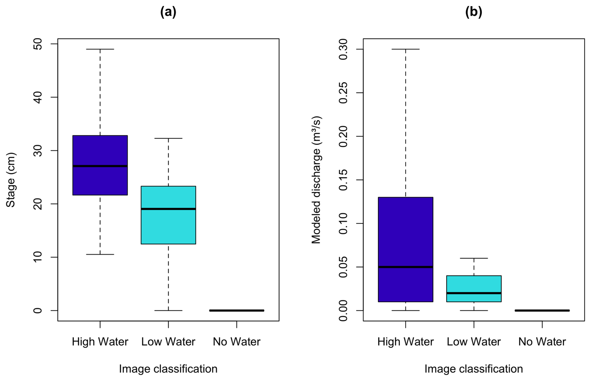 Figure A7Distribution of Perry Creek (PEC) stage and modeled discharge for medium- and high-confidence image classifications. The boxplots show all values for stage (a) and modeled discharge (b) at PEC (vertical axis) corresponding to medium- and high-confidence (only) classifications of images as high, low, and no water (horizontal axis). The boxplots show the interquartile range (IQR; box), median (bold line), the upper/lower quartile ±1.5 ⋅ IQR (whiskers), and outliers (points).