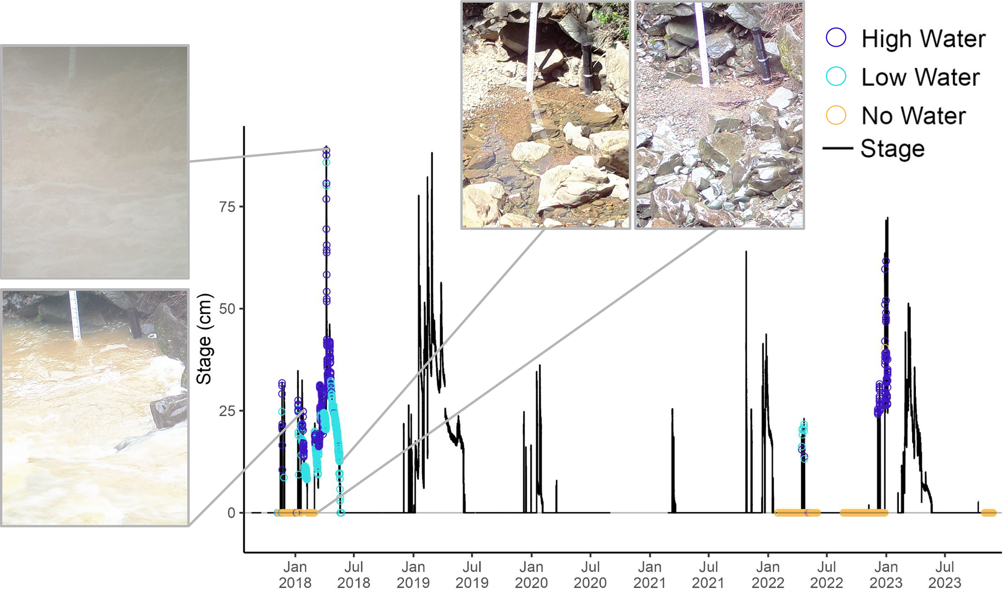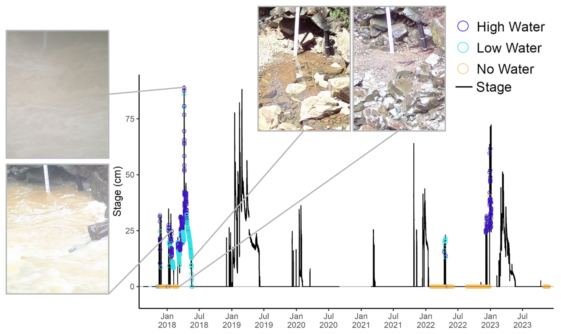 Figure 9Barometrically compensated and quality controlled stage from the Perry Creek (PEC) site from August 2017–November 2023. The time series shows PEC stage (vertical axis) across the full study period (horizontal axis) colored by concurrent high-confidence image classifications (colored points). Four example field camera images are shown. Field camera images were not available from 2019–2021.