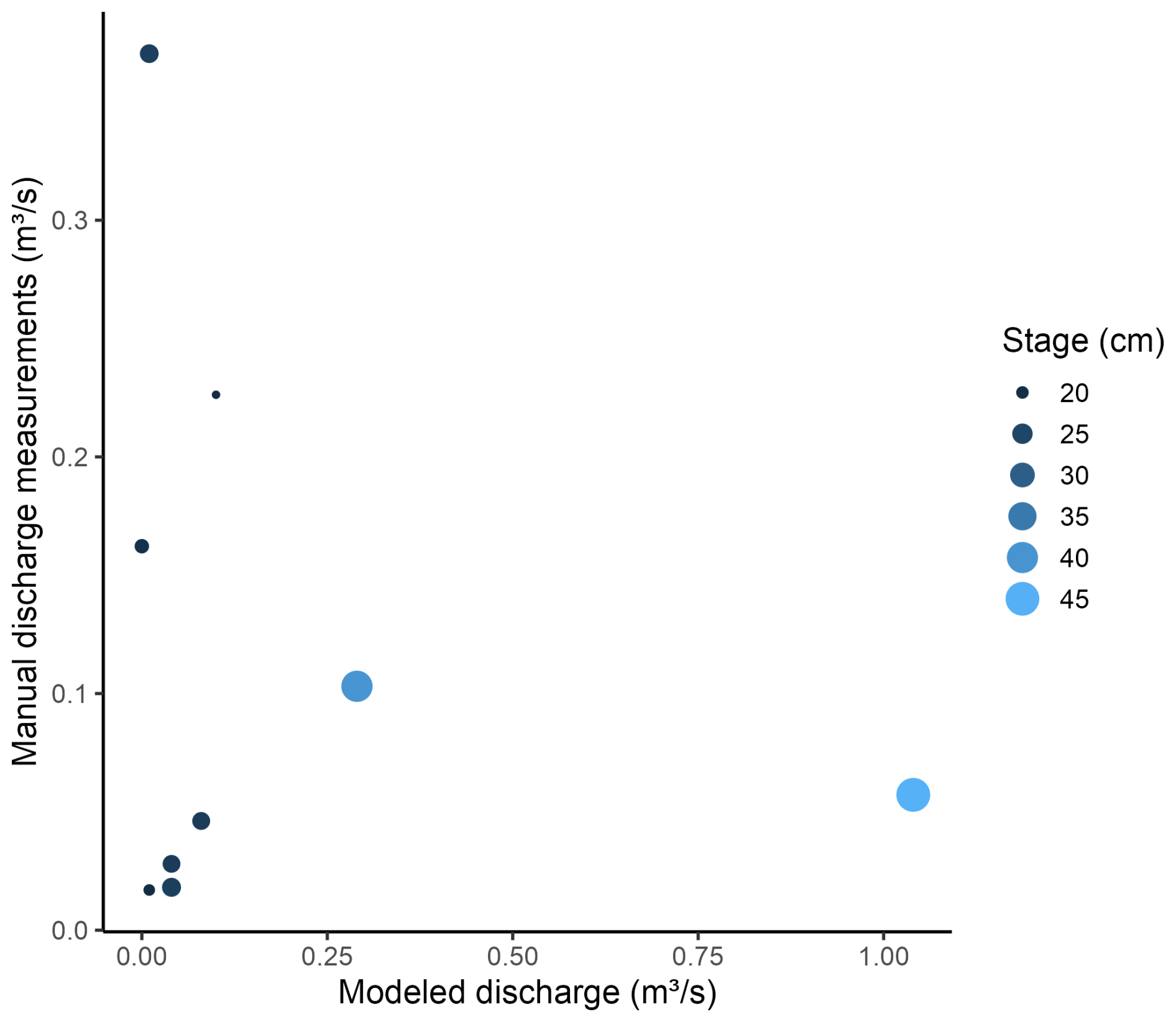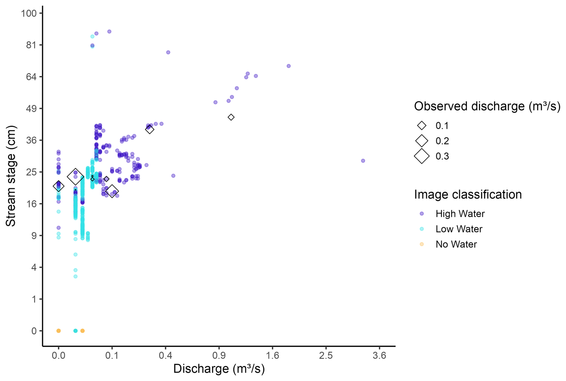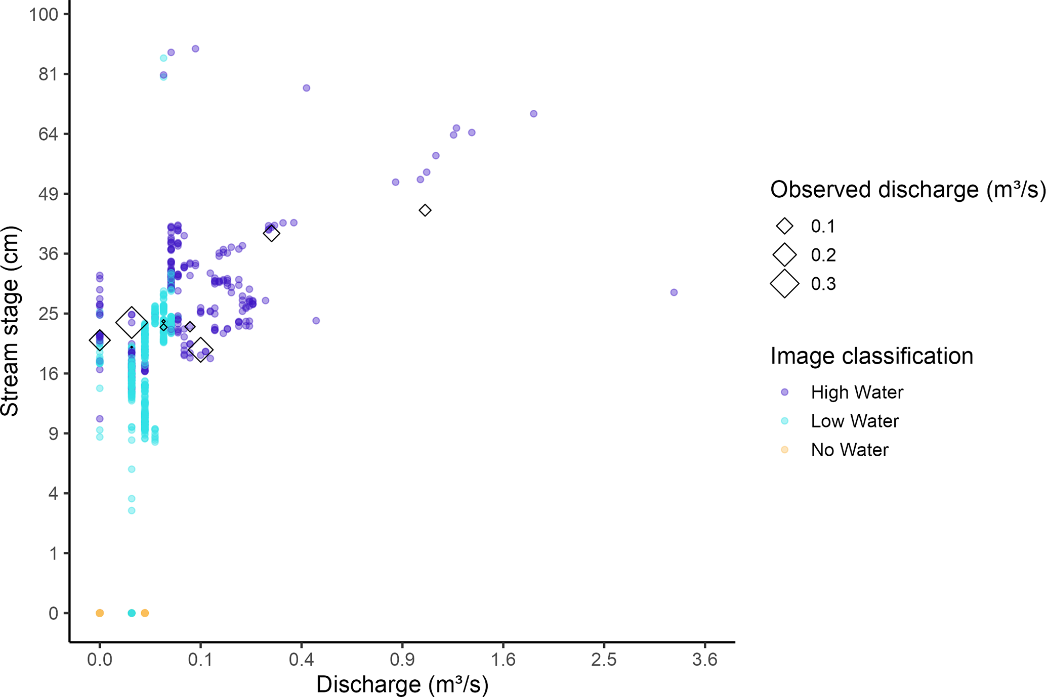 Figure 11Comparison between modeled discharge, manual discharge measurements, and observed stage at Perry Creek (PEC). Points show observations of stage (cm, vertical axis) and corresponding modeled discharge (m3 s−1, horizontal axis), according to the corresponding high-confidence image classification (color). The value of available manual discharge measurements (unfilled diamonds) corresponding to the observed stage and modeled discharge points are shown according to their magnitude (m3 s−1, diamond size).