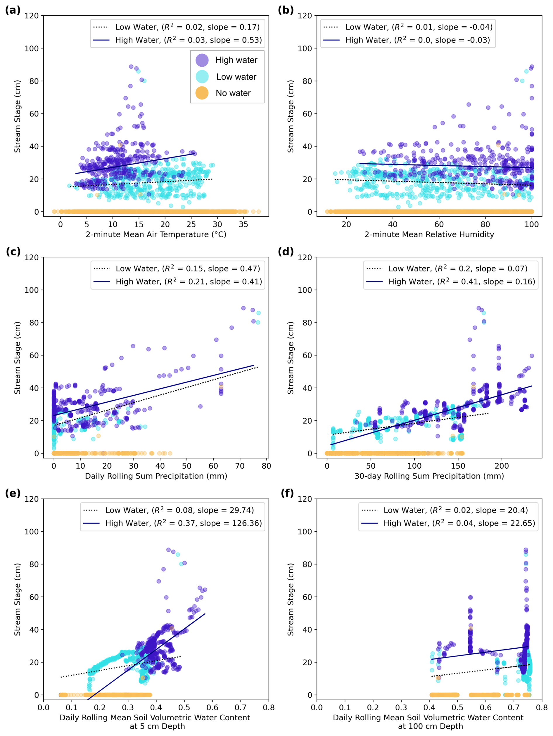 Figure 12Correspondence between Perry Creek (PEC) stage and concurrent surface meteorology and soil moisture data. PEC stage (cm, vertical axis) and its concurrent medium or high-confidence image classification (point color) compared to (horizontal axes): (a) 2 min mean air temperature, (b) 2 min mean relative humidity, (c) daily rolling sum precipitation, (d) 30 d rolling sum precipitation, and daily rolling mean soil volumetric water content at (e) 5 cm depth and (f) 100 cm depth. Linear regression estimates (lines, insets) summarize the relationship between stage and environmental data (a–f) for “low water” (dotted lines) and “high water” (solid lines) image classifications.