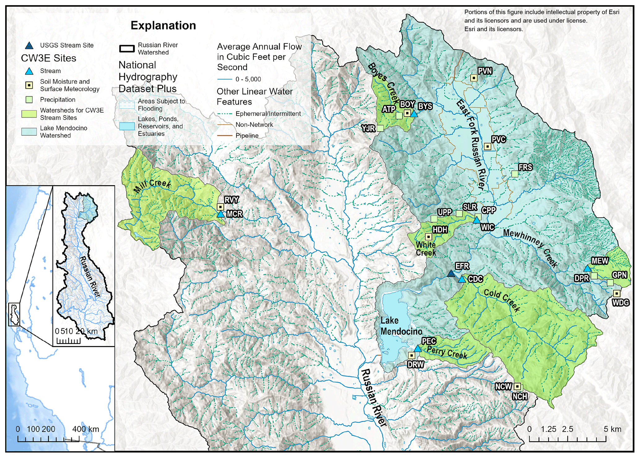 The Center for Western Weather and Water Extremes (CW3E) at the Scripps Institution of Oceanography installed a hydrologic and meteorological sensor network during the fall and summer of 2017 in the upper Russian River watershed, CA (Fig. A1; Sumargo et al., 2021; Ralph et al., 2022). This network supports a reservoir operations strategy called Forecast Informed Reservoir Operations (FIRO) at Lake Mendocino, an impounded reservoir used for drinking water, flood control, hydroelectric generation, and recreation (Jasperse et al., 2020). The upper Russian River watershed is a rain-dominated basin characterized by a variable Mediterranean climate with warm, dry summers and cool, wet winters where atmospheric rivers can result in heavy rainfall and flooding (Sumargo et al., 2021). The mountainous portion of the watershed that drains into Lake Mendocino is composed of Mesozoic Franciscan Formation bedrock and is a lightly-managed combination of shrub/scrub, forest (deciduous, evergreen, and mixed), and herbaceous land cover (USGS, 2023); in contrast, the alluvial valleys are largely cultivated or developed (Cardwell, 1965; USGS, 2023).