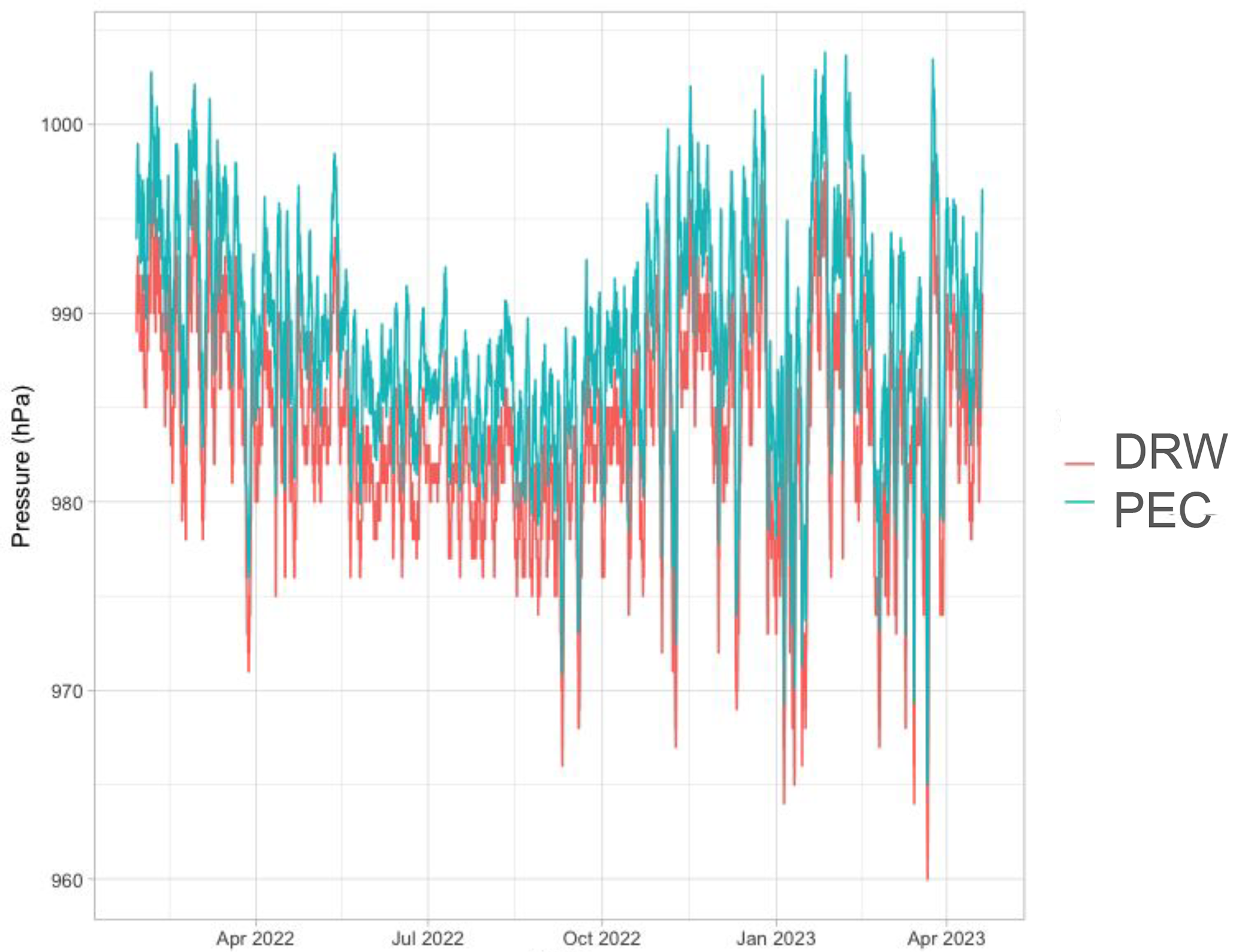 Figure A3Perry Creek (PEC) barologger atmospheric pressure and Deerwood (DRW) surface meteorology site atmospheric pressure.