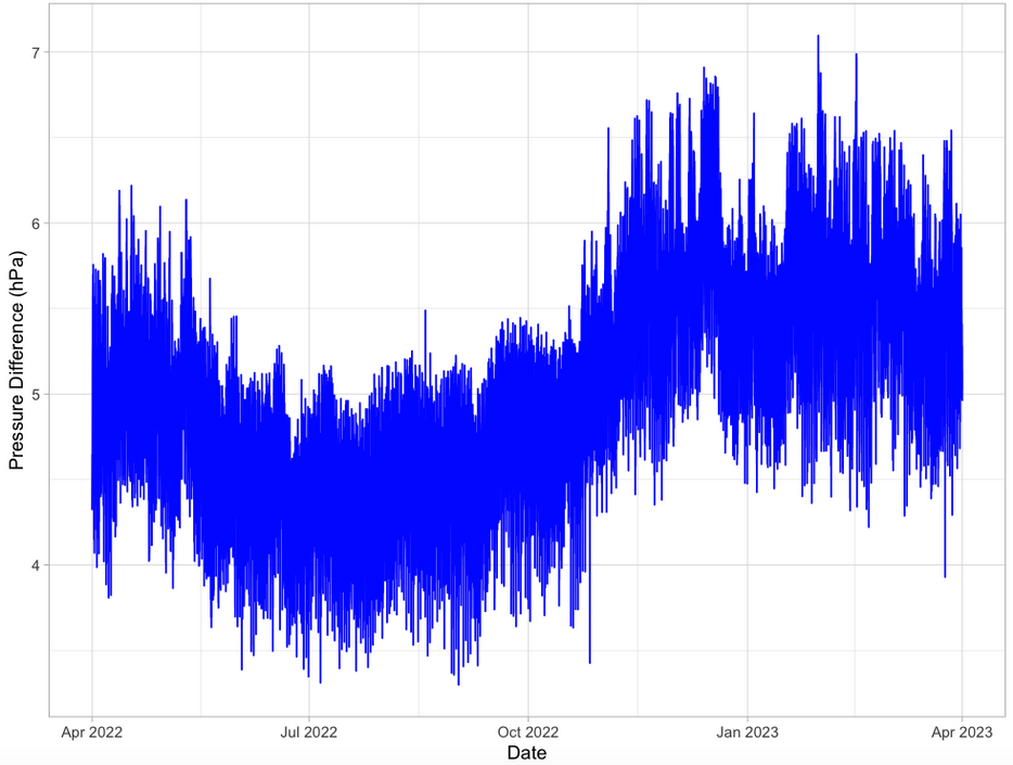 Figure A4Difference between Perry Creek (PEC) barologger atmospheric pressure and Deerwood (DRW) atmospheric pressure from April 2022 through March 2023.
