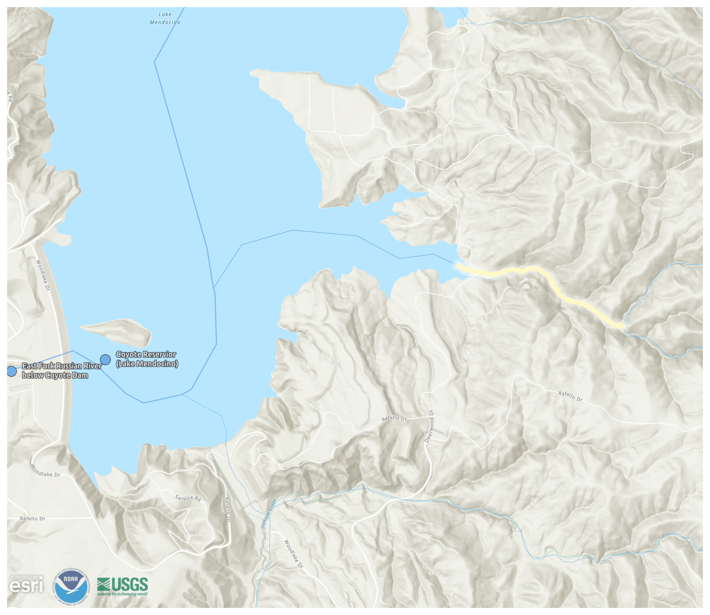 Figure A5The National Water Model segment of Perry Creek that overlaps with the Perry Creek (PEC) monitoring site. The stream segment is highlighted in light yellow, and the PEC site (not shown) is located just upstream of Lake Mendocino along the stream segment in this image. Image source: Esri, NOAA (2024b).