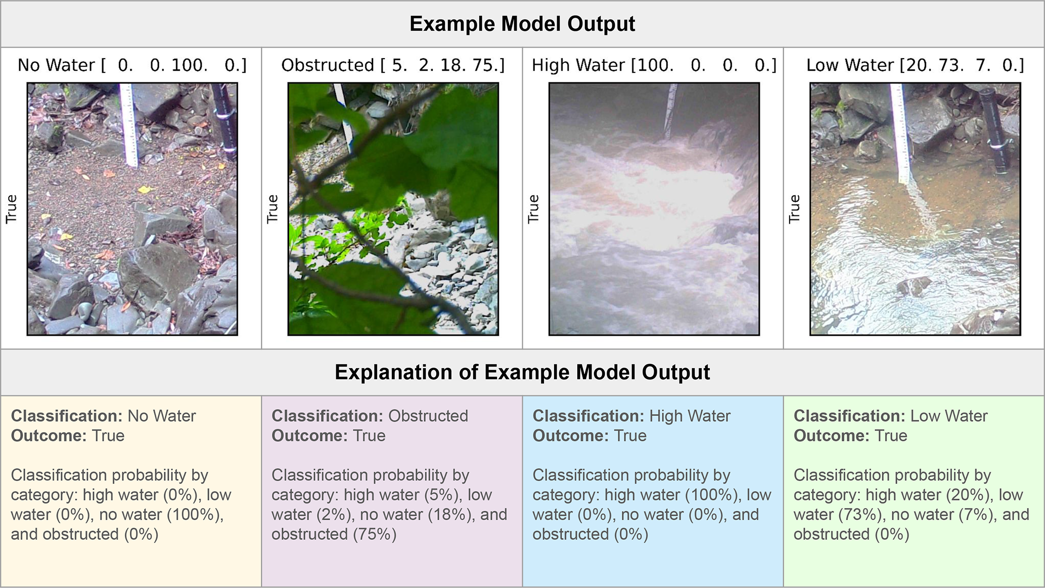 Figure A6A sample of labeled test set images and corresponding classification outputs from the final model run. The images are annotated (text above images) with the classification (high water, low water, no water, or obstructed category labels) and the classification probabilities for each category (%). The simple outcome (“True” for correct classifications and “False” for incorrect classifications) is to the left of each image. A detailed explanation of the classification output is below each corresponding image.
