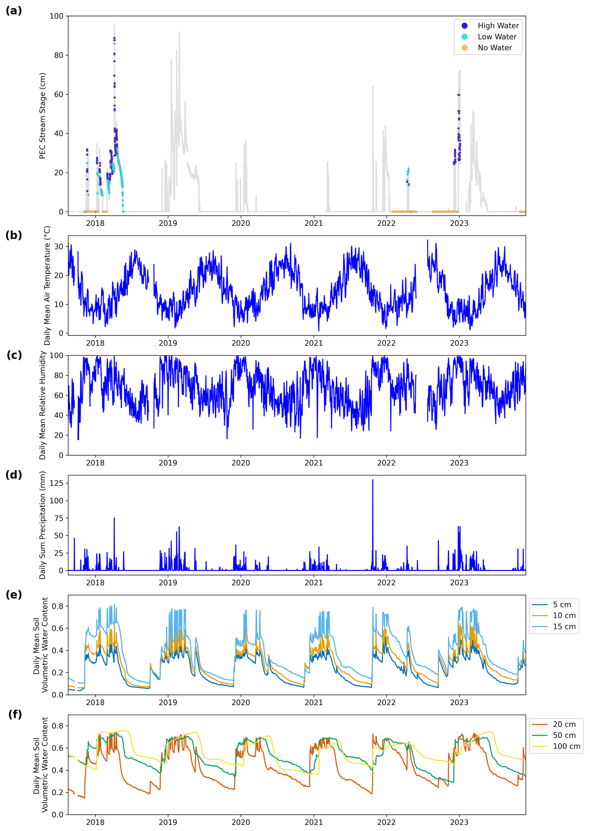 Figure A8Perry Creek (PEC) stage and Deerwood (DRW) site meteorology and soil moisture, August 2017–November 2023. Time series include: (a) 15 min barometrically compensated and quality controlled PEC stage colored by concurrent medium or high-confidence image classifications; and daily DRW (b) mean air temperature, (c) mean relative humidity, (d) total precipitation, (e) mean soil volumetric water content (at depths of 5, 10, and 15 cm), and (f) mean soil volumetric water content (at depths of 20, 50, and 100 cm).