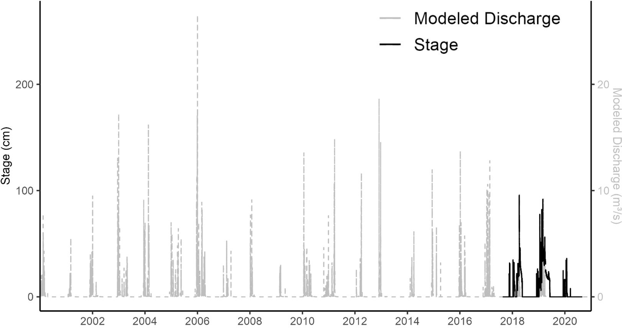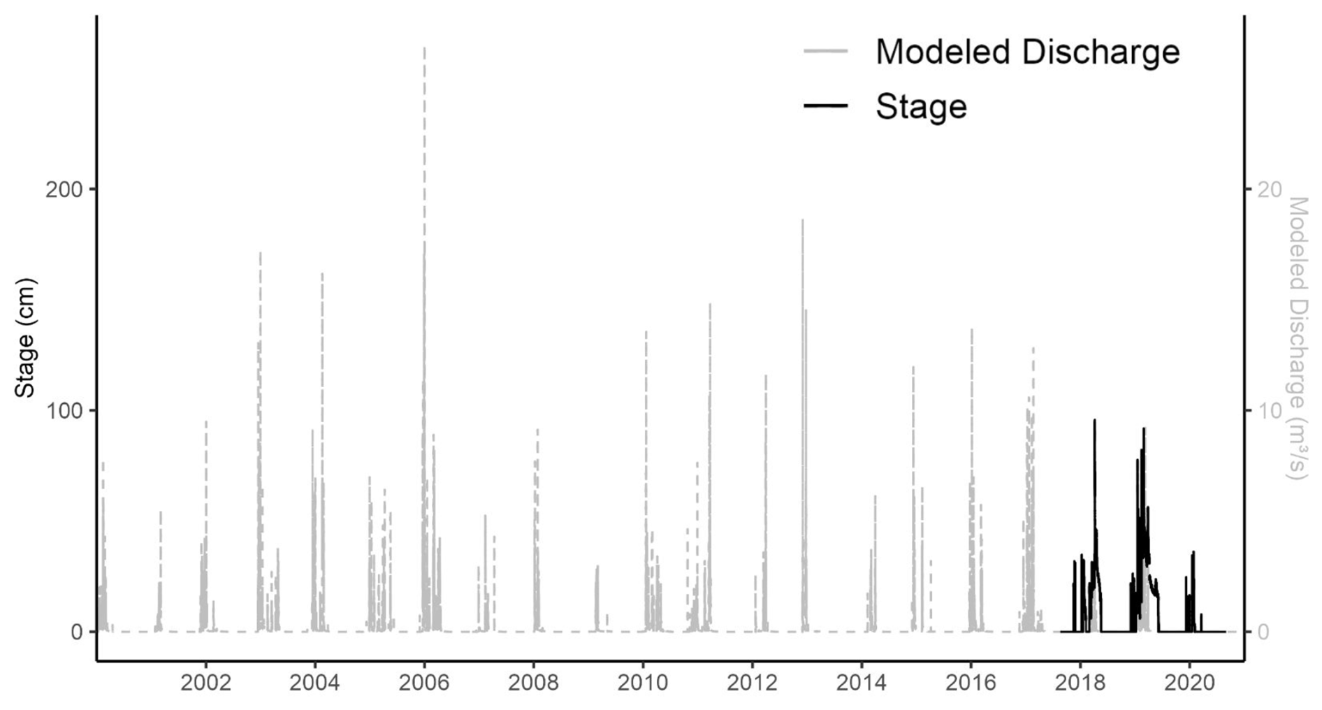 Figure A10Time series of National Water Model (NWM) discharge and stage measurements at Perry Creek. Lines show partially-overlapping observations of observed stage at the Perry Creek (PEC) site (left vertical axis, solid black line) between 2017–2020, and modeled discharge (right vertical axis, dotted gray line) at a stream segment overlapping PEC between 2000–2020.