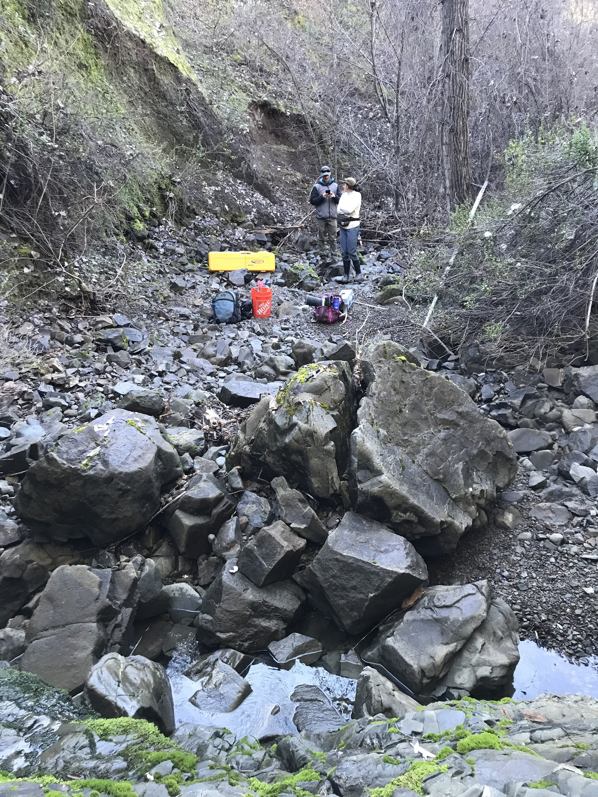 Figure A11Photo from a Perry Creek (PEC) site visit in January 2022. The photo shows a small pool of water upstream of the PEC site in front of the last visible outcrop of Franciscan sandstone. The rocky, dry streambed is visible in the middle, with the white staff plate on the right. The steep hillside on the left is a landslide deposit. This photo was taken looking downstream.