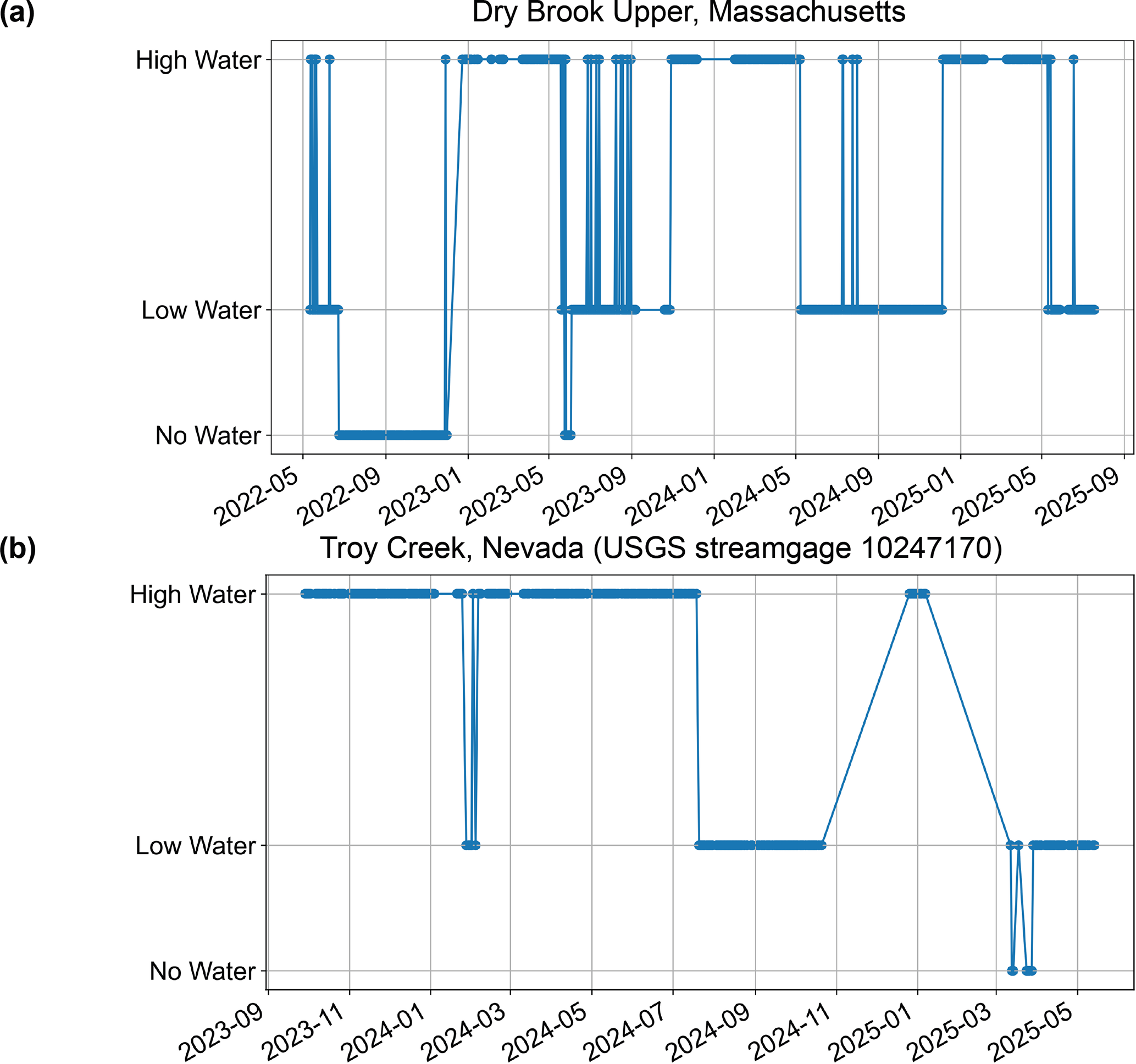 Another low-cost method for determining IRES states is using simple sensors that record time series data to indicate the stream state. For example, a measure of high electrical conductivity indicates that a stream is wet and low (or zero) conductivity indicates that a stream is dry (Chapin et al., 2014). Observations of water occurrence from conductivity sensors have also been combined with time-lapse imagery and stage measurements to gain a broader understanding of the spatial and temporal characteristics of the stream network (Kaplan et al., 2019). Alternatively, stream temperature measurements have been used in combination with statistical models to determine the presence of water in several IRES in the northwest Great Basin desert, USA (Arismendi et al., 2017). Finally, observations of sound produced by rivers can be used as a proxy for stage (Osborne, 2022), and may present another scalable low-cost solution to IRES monitoring.